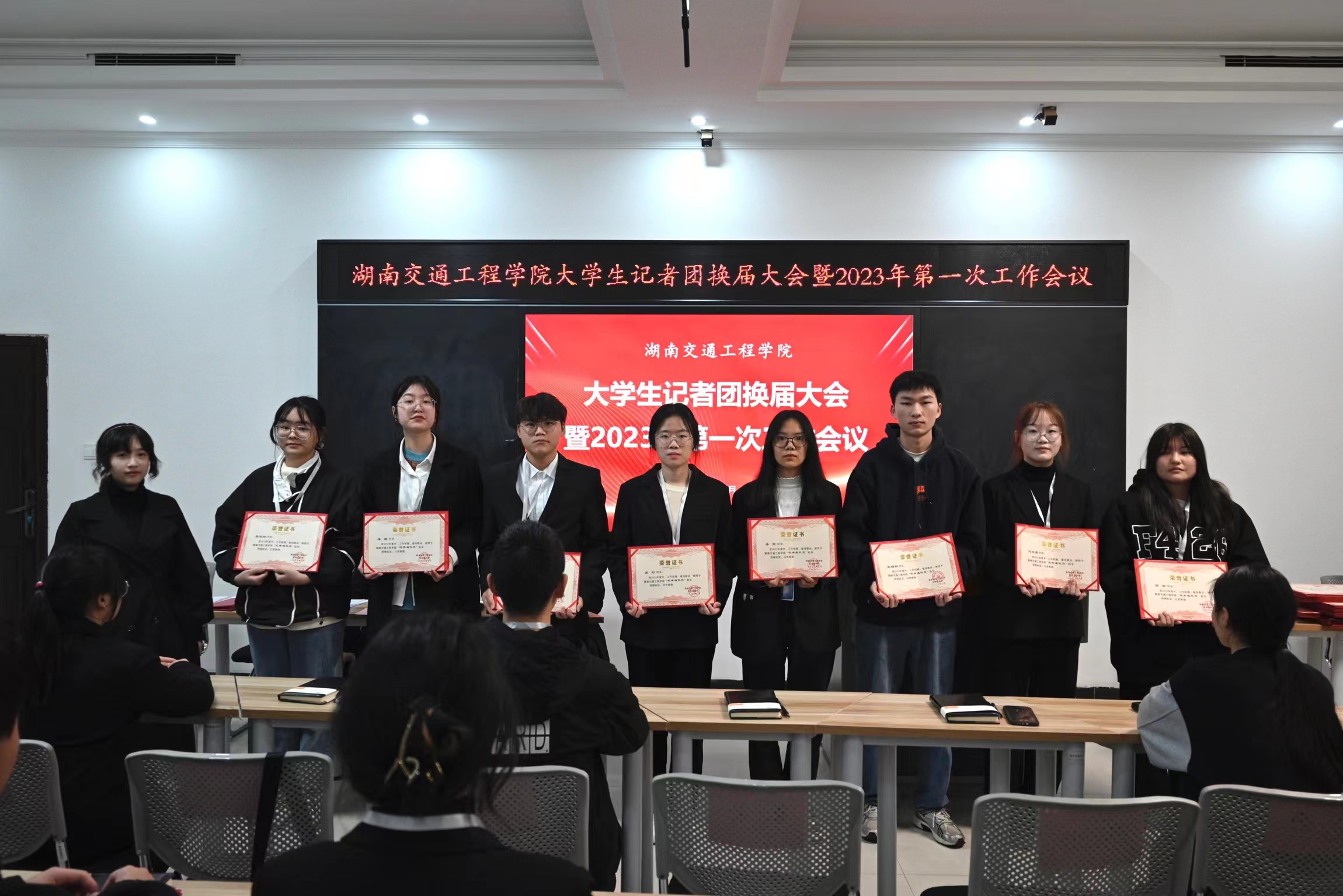 向妮娜宣读《新葡萄8883官网AMG官网大学生记者团2022年优秀通讯员名单》,宣传部范睿庭老师为优秀通讯员颁发荣誉证。