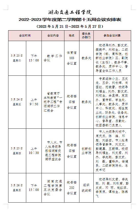 新葡萄8883官网AMG官网2022-2023学年度第二学期第十五周会议安排表