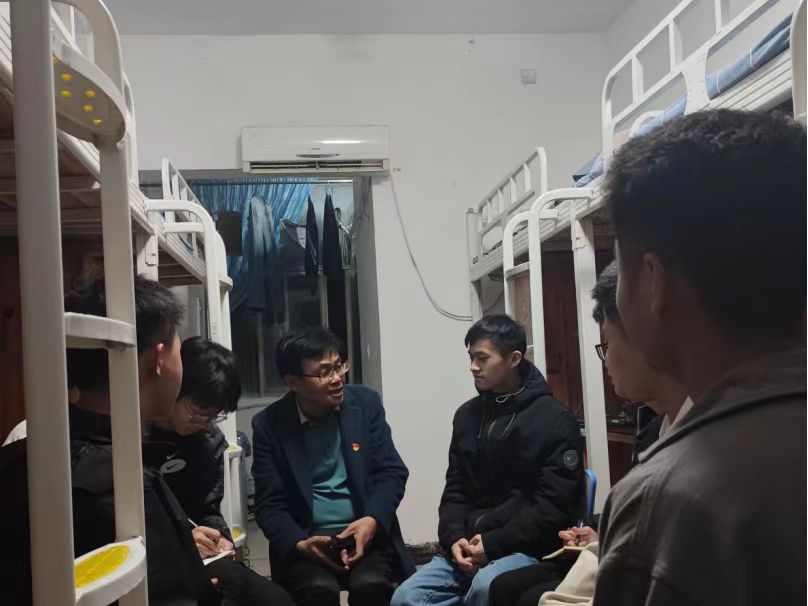 随后,在与九栋学生交谈中,辅导员何立权对学生提出的关于学习、生活和校园安全管理等各方面的问题进行一一解答。何立权老师强调,同学们应加强自我管理,严格落实学校各项规章制度,保持干净整洁的寝室环境,养成健康文明、积极向上的生活习惯,要不断提高校园安全意识,践行“厚德、善思、强能、笃行”的校训,立志做有理想、敢担当、能吃苦、肯奋斗的新时代好青年,也要充分利用在校课余时间开展各类有益身心健康的科研、文体活动,让自己大学生活变得丰富多彩。
