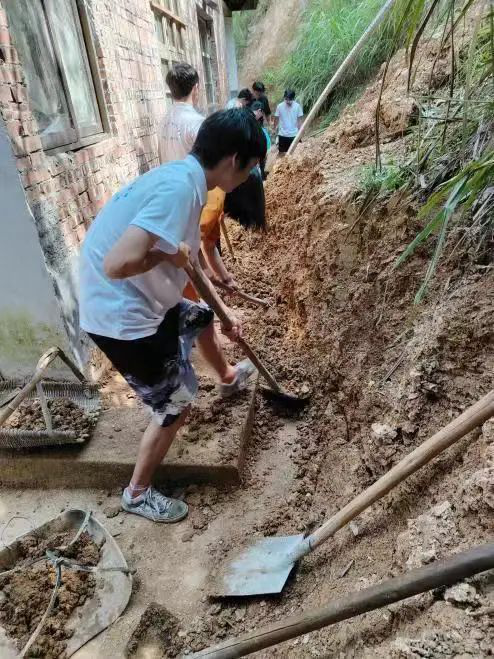 随后,在汤赞等三位老师的带领下,乡村振兴团团队志愿者们带着坚定的信念和充足的干劲,投身于清淤重建的工作中,利用铁锹、扫帚、拖车等工具,对受暴雨影响引发的山体滑坡、泥沙淤积的合作社房屋后面进行清理。