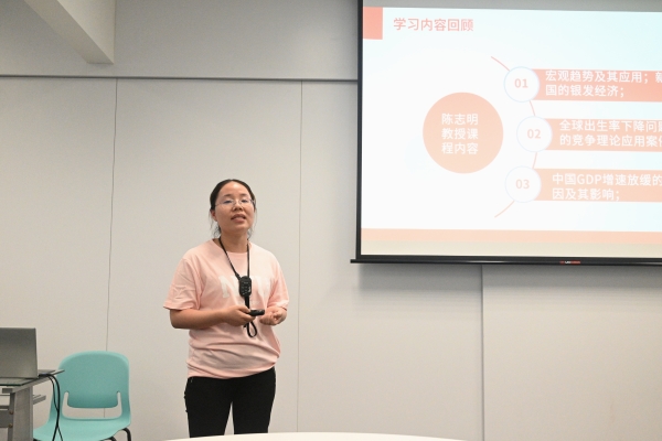 首先是各小组代表总结汇报,谈收获、讲体会、说感悟、做打算。谭园玲以《培训引领成长,感悟铸就未来》为题代表第三组汇报,李金梅以《适应新变局,创新推进理论与实践教学》为题代表第四组汇报,曾歌以《学以致用,笃行致远——新加坡培训学习心得体会》为题代表第六组汇报,杨子瑶、殷永平、龚凡超和张妃四人组合以《从新加坡的变化对我们的启示》代表第五组汇报。各组汇报代表以饱满的热情和严谨的态度,融合全组人员感悟与收获,认真准备,精彩汇报。他们围绕《宏观趋势及其应用》《新加坡和中国的银发经济》《中国GDP增速放缓的结构性原因及其影响》等主题,不仅系统地总结了学习期间的知识收获与技能提升,更重要的是能够将所学内容与学校的发展规划、本科教学合格评估、教育教学改革与高质量转型发展等工作紧密结合,提出了诸多具有前瞻性和实操性的建议。汇报图文并茂,逻辑清晰,客观全面,亮点纷呈,让与会者深刻感受到了研修班的学习成果与实效及智慧碰撞,同时充分展示了教师们高瞻远瞩的思想深度和脚踏实地的实践精神。