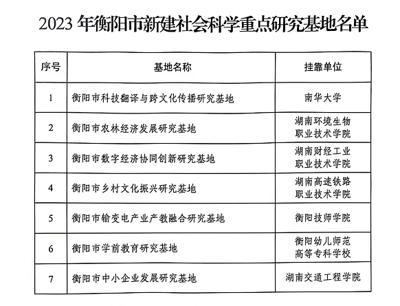 本网讯(通讯员 赵红深 )近日,衡阳市社科联发布《关于2023年衡阳市社会科学重点研究基地的通报》,新葡萄董事、创新创业学院院长董晔卉负责的“衡阳市中小企业发展研究基地”榜上有名。