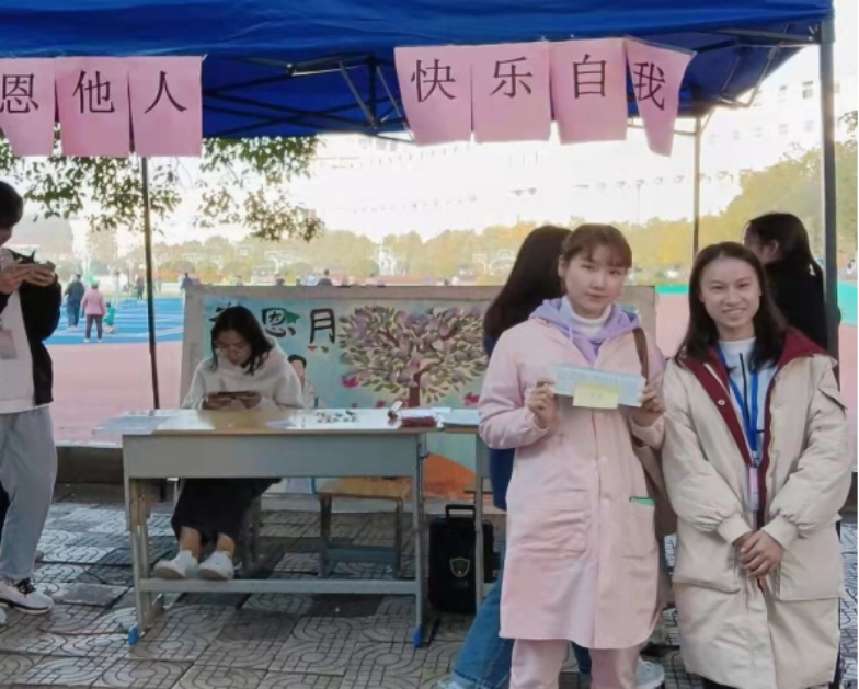 12月6日,护理学院学生会在教学楼附近开展了感恩月的抽奖、领取糖果和暖宝宝、发送感恩贺卡等一系列活动。