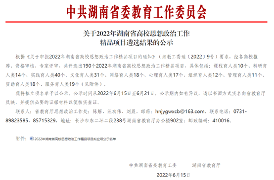 据悉,2022年共评出190个湖南省高校思想政治工作精品项目。具体包括:课程育人类10个、科研育人类14个、实践育人类40个、文化育人类31个、网络育人类18个、心理育人类17个、组织育人类12个、管理育人类11个、资助育人类18个、服务育人类19。项目培育建设周期一般为2年。