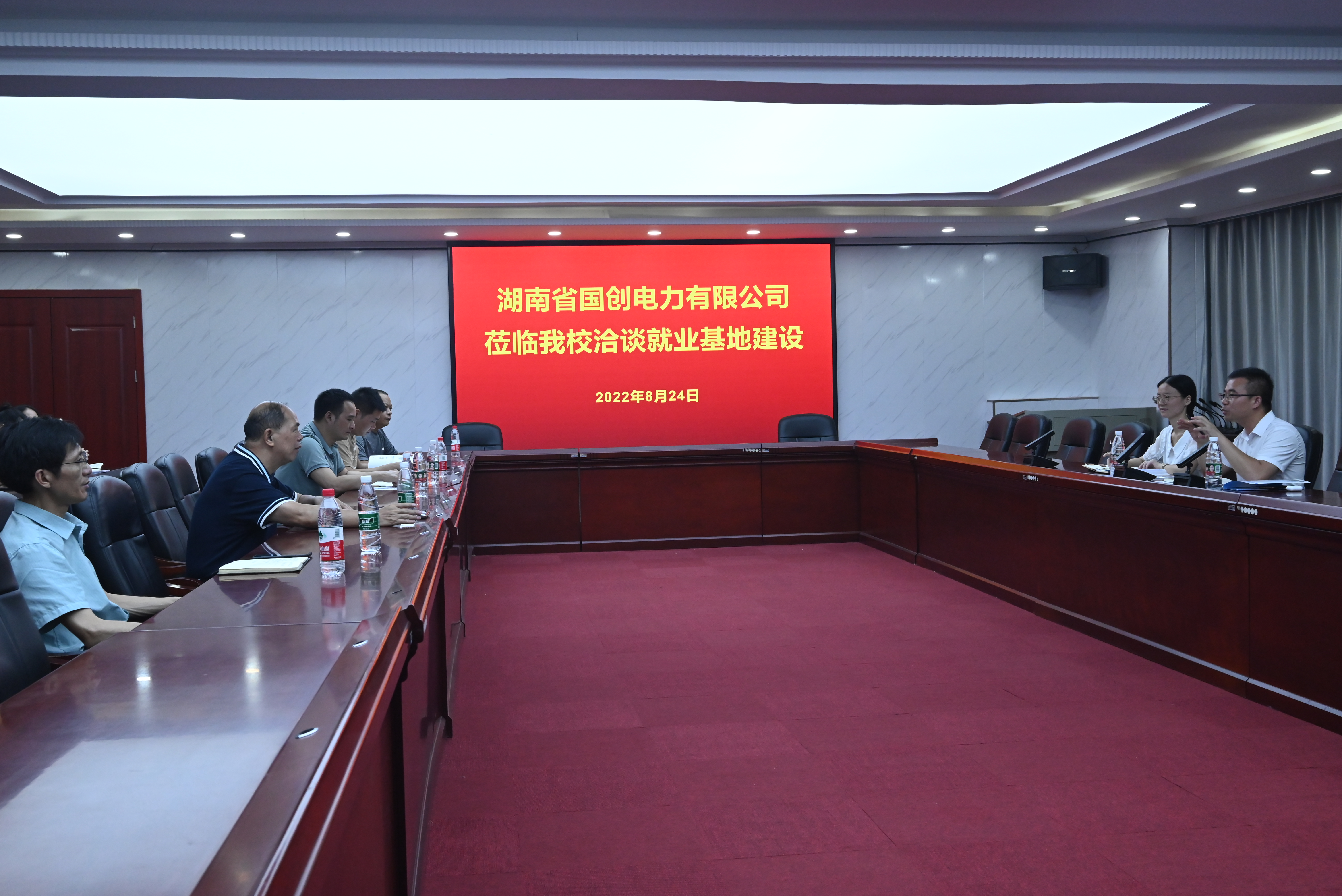 本网讯(记者 摄影 赵红深)8月24日上午,学校在体育馆103会议室与湖南省国创电力有限公司举行校企合作洽谈并签订毕业生就业基地建设协议。就业基地建设涵盖建立实习就业基地、联合招生、互派师资、合作办学培养等校企合作重点事项。公司人力资源总监刘文广、人力资源部经理龙倩等,学校常务副校长彭文武,电气与信息学院院长杨兵初、机电工程学院副院长杨启正等参加了签约仪式,招生就业处负责人宁平阳主持会议。