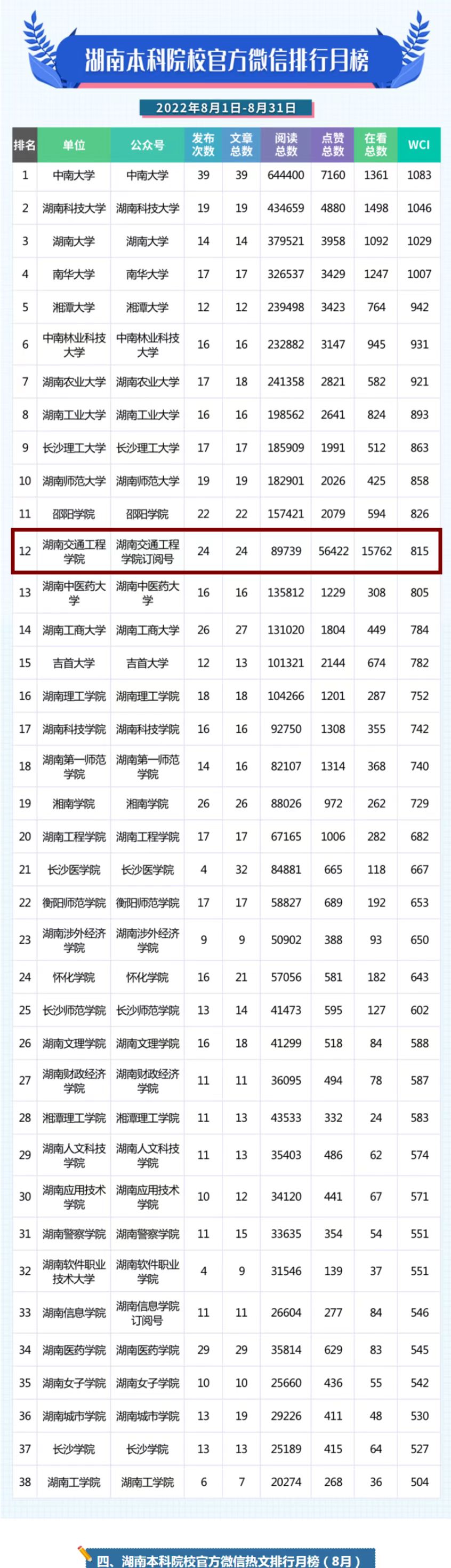 本网讯(记者 赵红深)8月,新葡萄官方微信订阅号共发文24次,推文24篇;文章阅读总数89739,点赞总数56422(6月37906),相比7月增加48.85%,排全省38所本科高校第1;在看总数15762(6月12156),相比7月增加29.66%,排全省38所本科高校第1;帐号WCI值保持800以上,排全省38所本科高校第12。新葡萄官方微信传播力和影响力在全省本科高校中排名稳定在第一方阵。