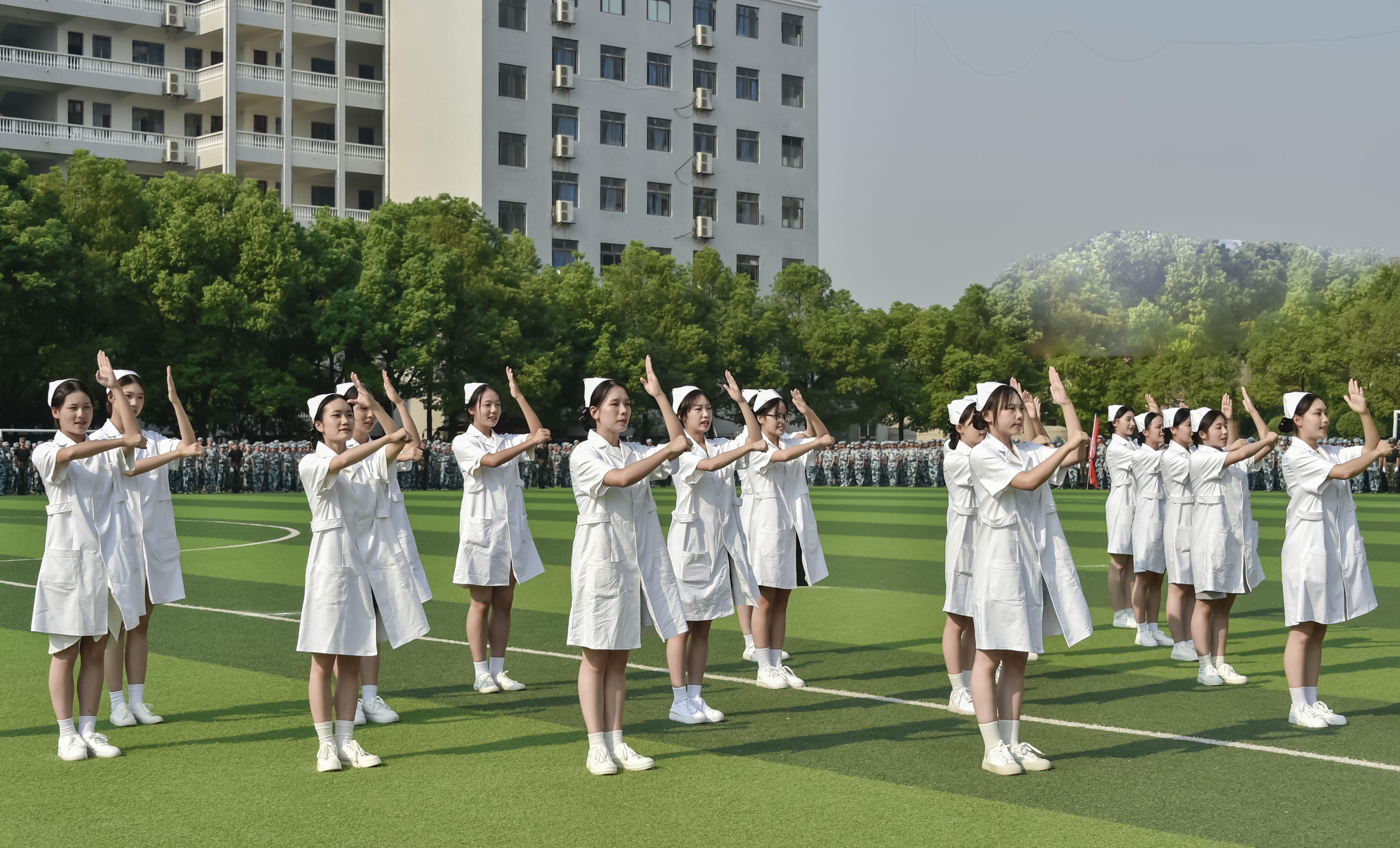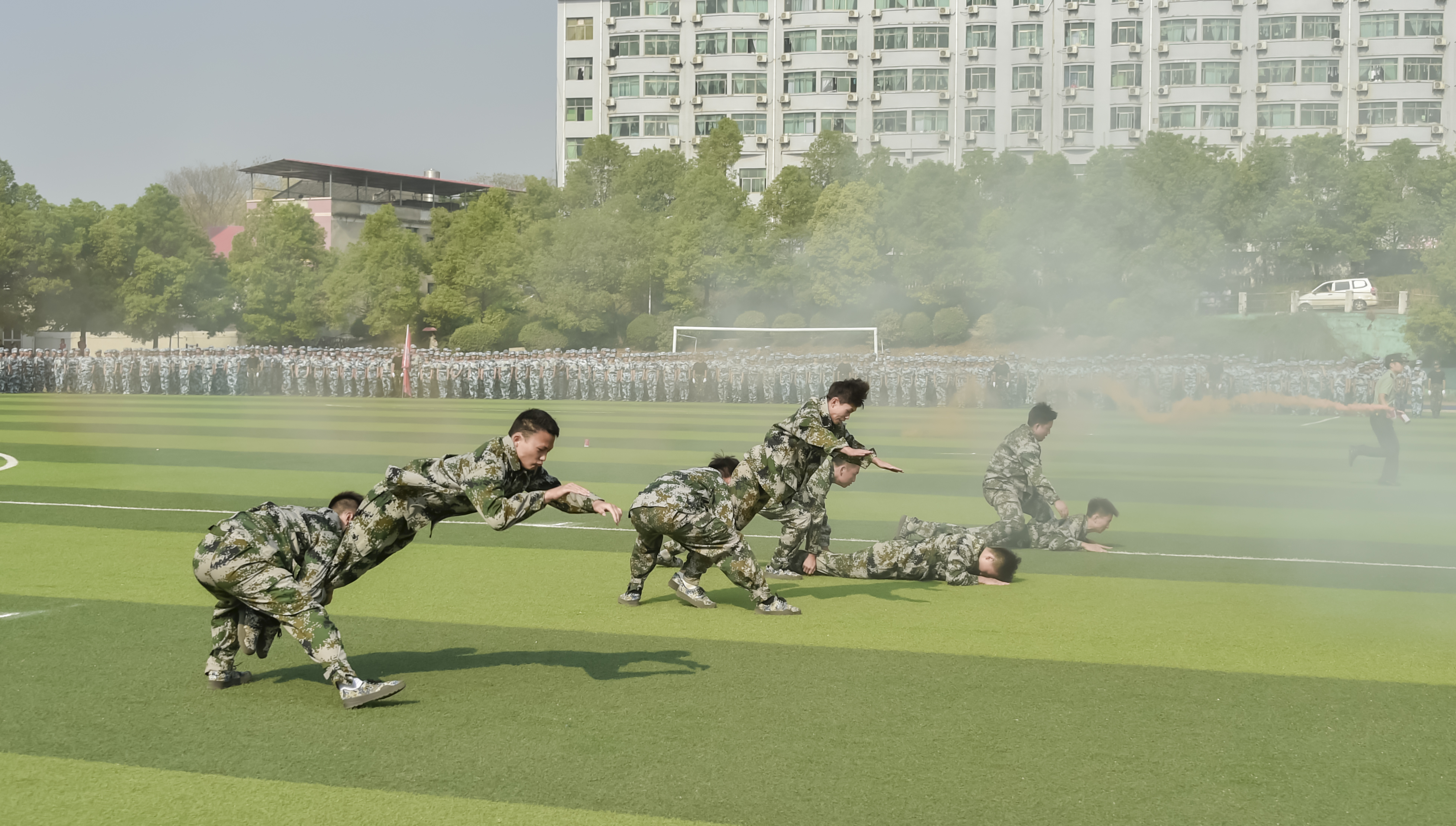 军事训练汇报表演分两步进行:第一步特色方阵表演,第二步分列式表演。在特色方阵表演中,医学技术与护理学院的一营表演《手语操》,电气与信息工程学院的五营表演《刺杀操》,经济管理学院的四营表演《匕首操》,机电工程学院的三营表演《擒拿格斗》,交通运输工程学院的二营表演《战术动作演示》,人文与艺术学院的六营表演了《我爱你中国》大合唱。各营表演各有特色,都有亮点。一声声铿锵有力的“嗨”,一个个刚劲勇武的拳腿,横踹侧踢、抱拳立定等动作行如流水,赢得军训队伍新生一片热烈喝彩。这铿锵有力、坚毅刚健的动作也展现了新时代大学生健康向上、积极奋进的精神面貌,诠释了“不负青春、不负韶华、不负时代”的初心使命。