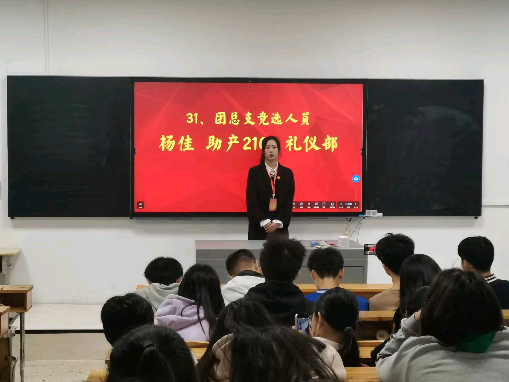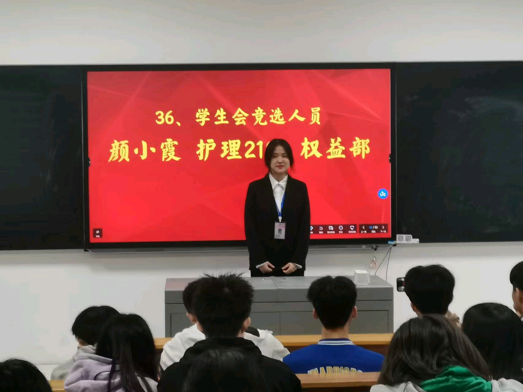 随后,竞选者们开始了今天的演讲。他们自信十足,展示了自己对工作岗位的认识与热情,述说了竞选的职位以及自己对竞选的职位的优势,同时也对以后的工作进行了规划。
