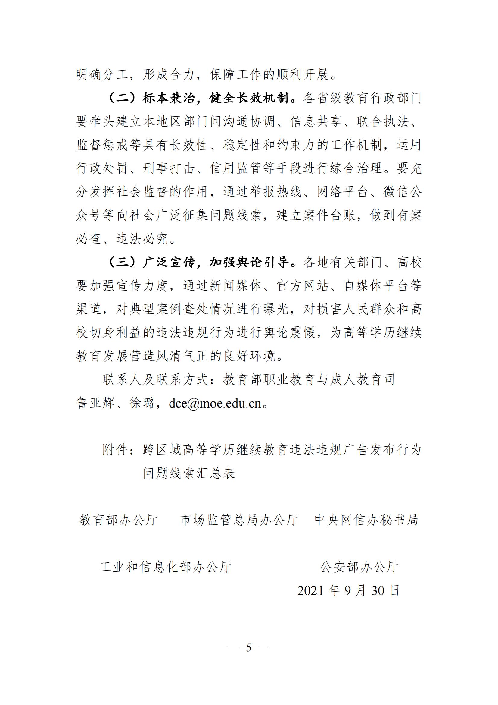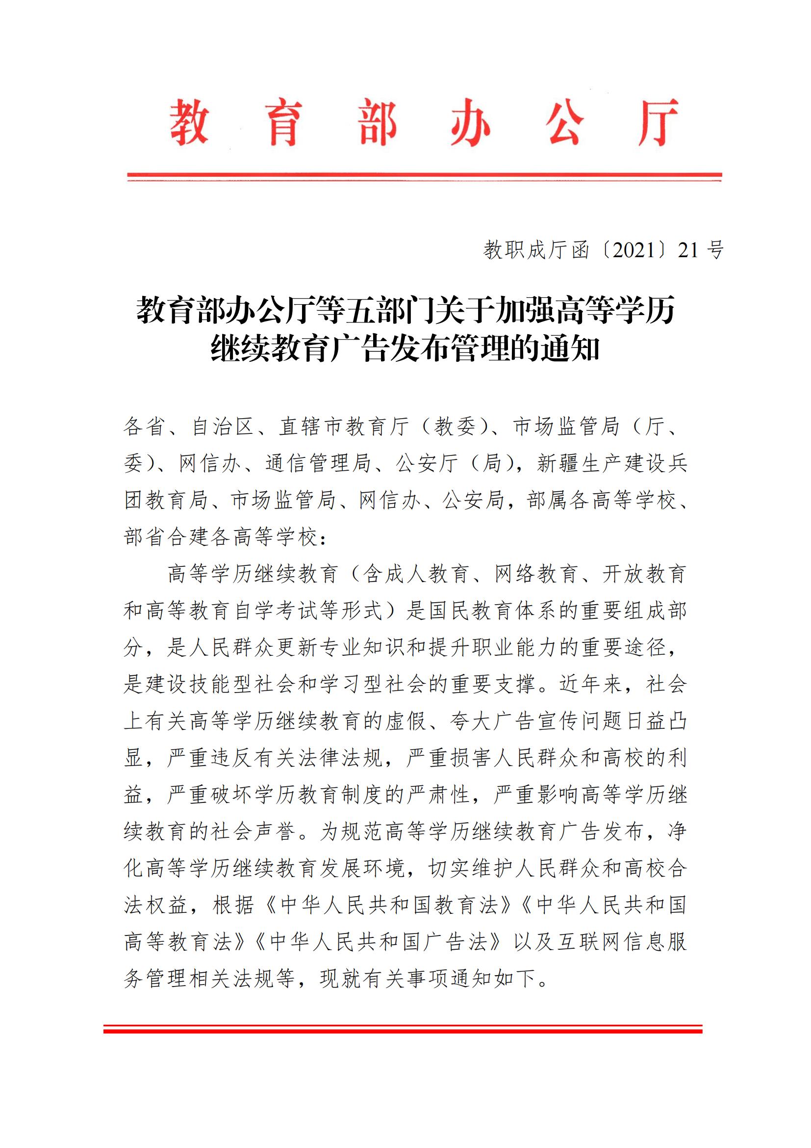 教育部办公厅等五部门关于加强高等学历继续教育广告发布管理的通知