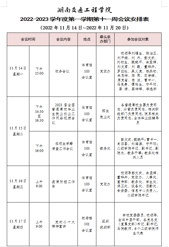 新葡萄8883官网AMG官网2022-2023学年度第一学期第十一周会议安排表