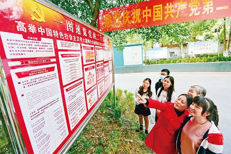 图为2022年10月18日,重庆市万盛经开区东林街道清溪桥社区,刚刚制作好的党的二十大宣传展板吸引了不少居民驻足阅览,热议并学习党的二十大报告。视觉中国 王泸州/摄