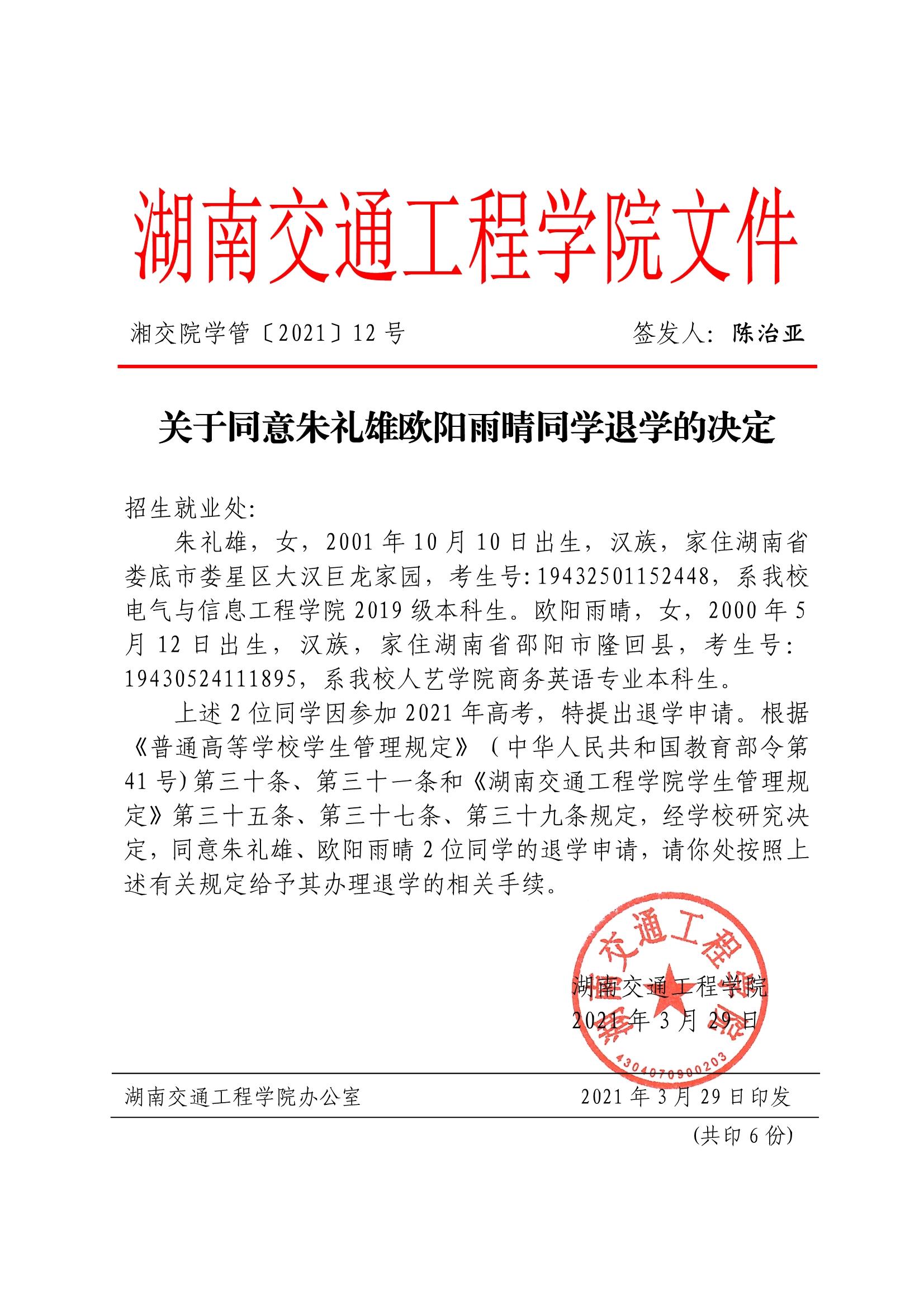 关于同意朱礼雄欧阳雨晴同学退学的决定(湘交院学管〔2021〕12号)