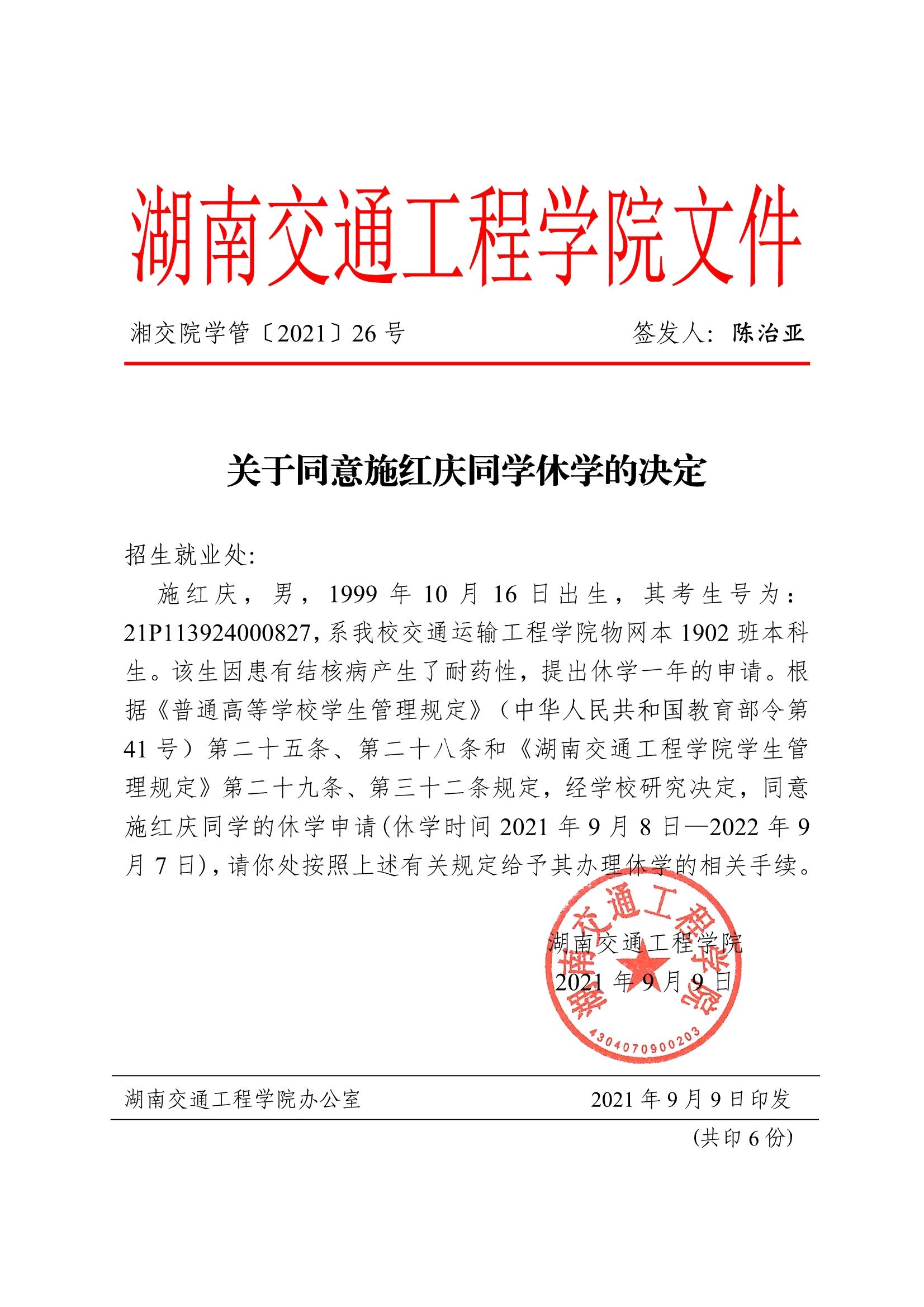 关于同意施红庆同学休学的决定(湘交院学管〔2021〕26号)