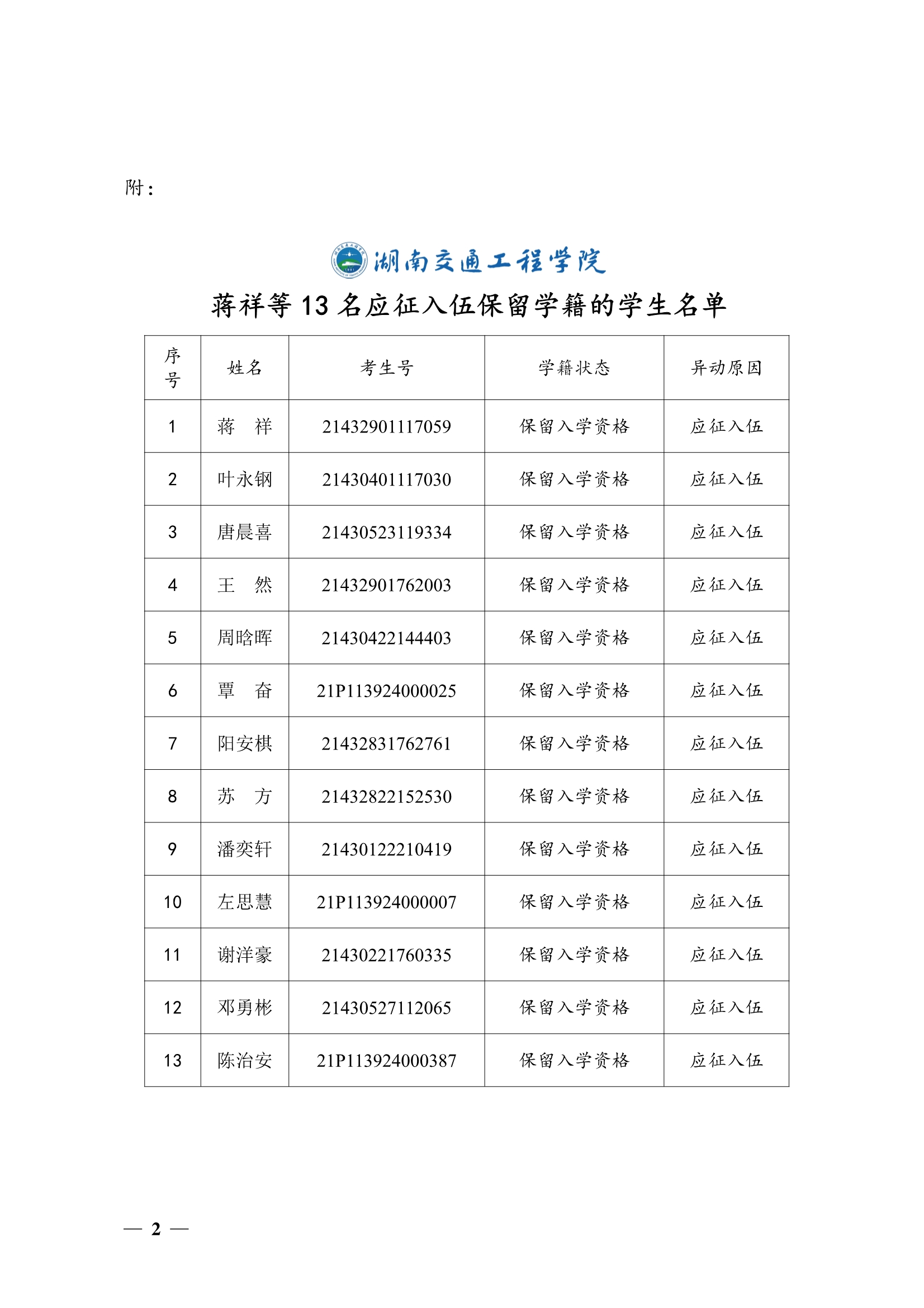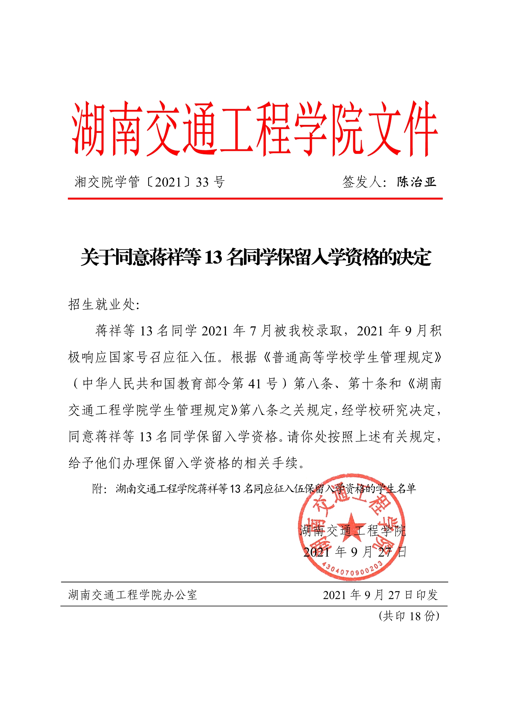 关于同意蒋祥等13名同学保留入学资格的决定(湘交院学管〔2021〕33号)