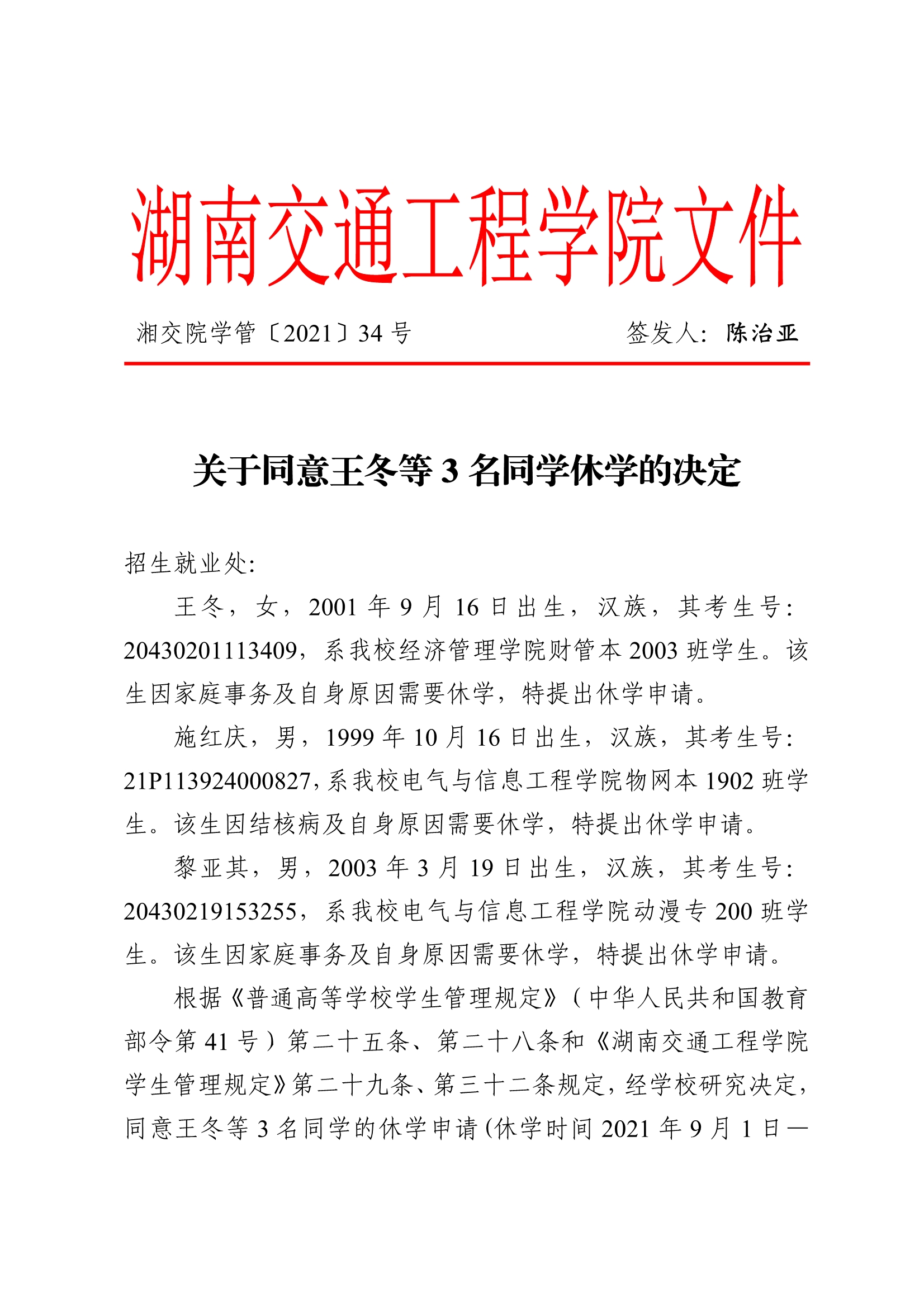 关于同意王冬等3名同学休学的决定(湘交院学管〔2021〕34号)