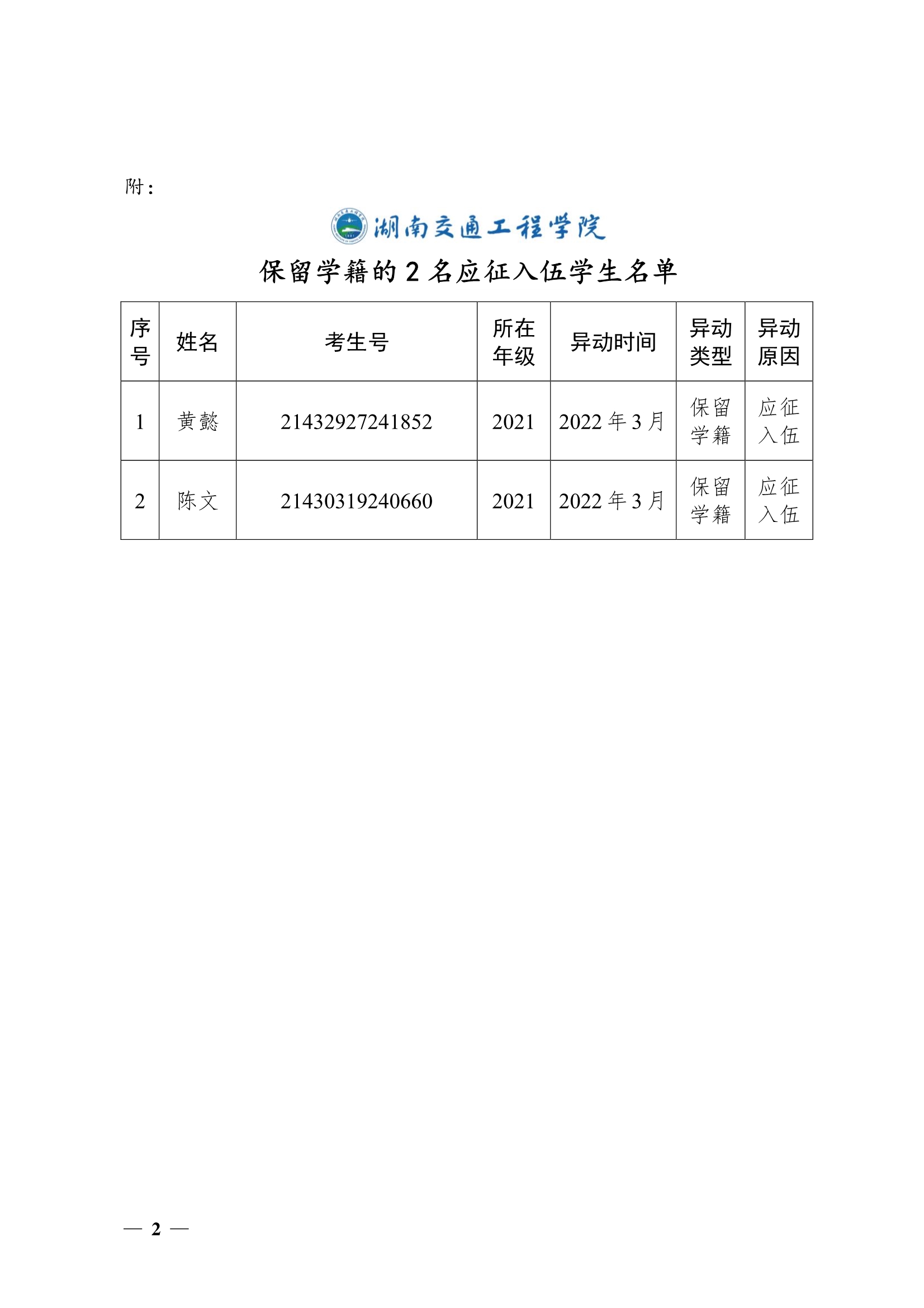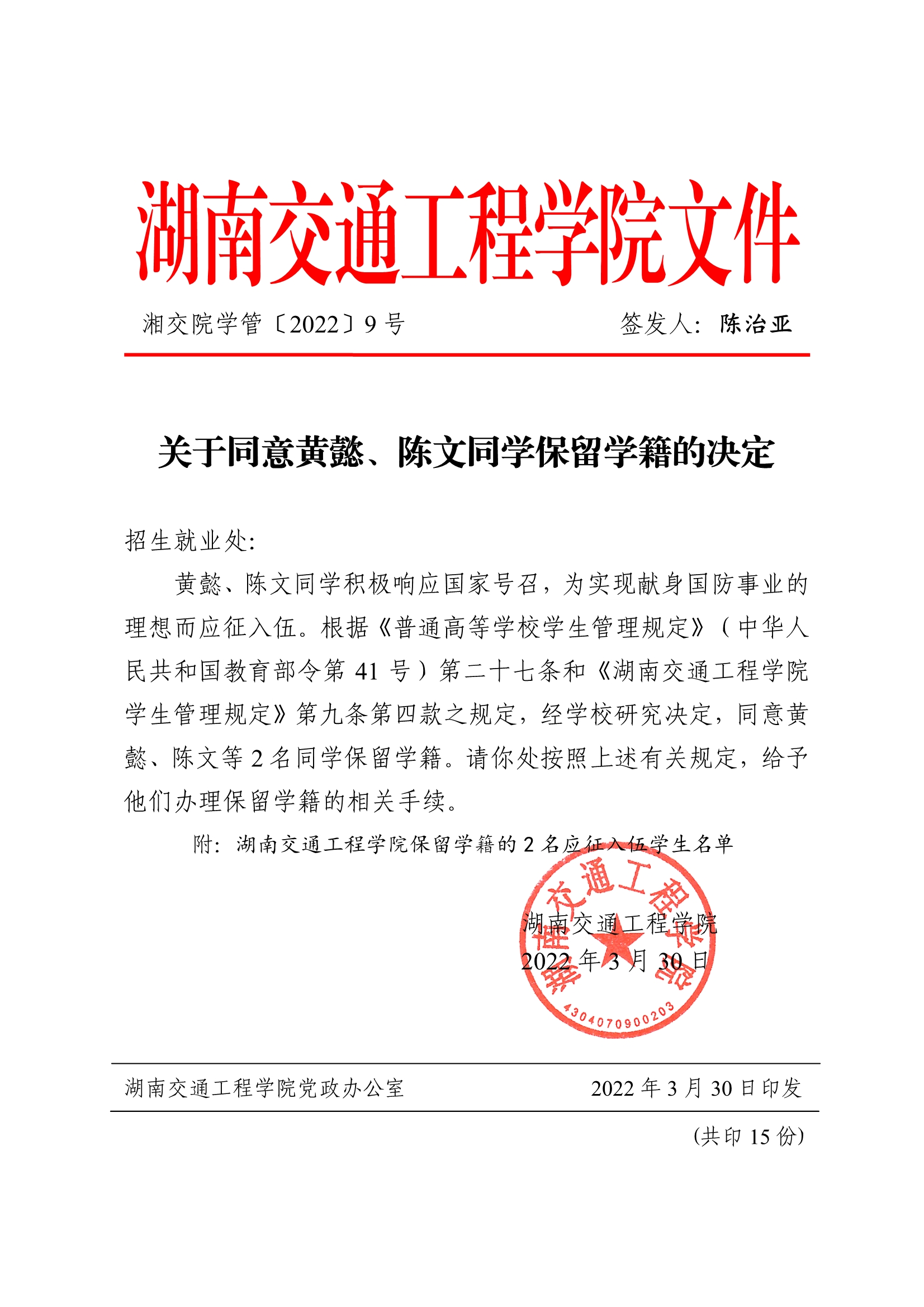 关于同意黄懿陈文同学保留学籍的决定(湘交院学管〔2022〕9号)