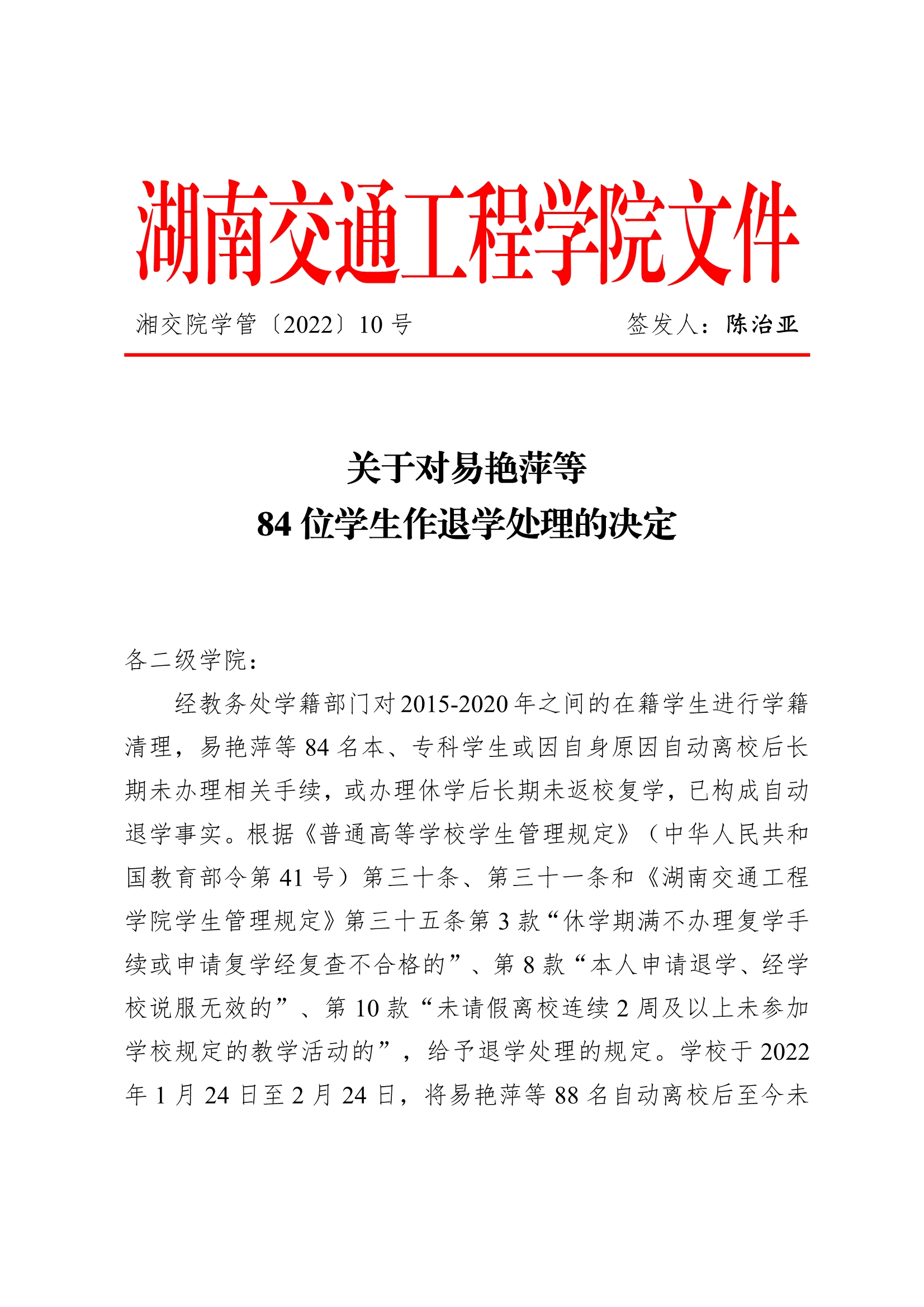 湘交院学管〔2022〕10号(关于对易艳萍等84位同学作退学处理的决定).pdf