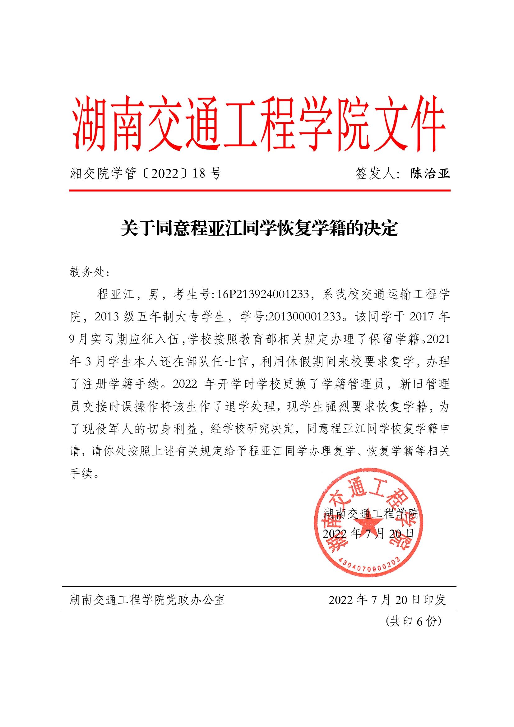 关于同意程亚江同学恢复学籍的决定(湘交院学管〔2022〕18号)