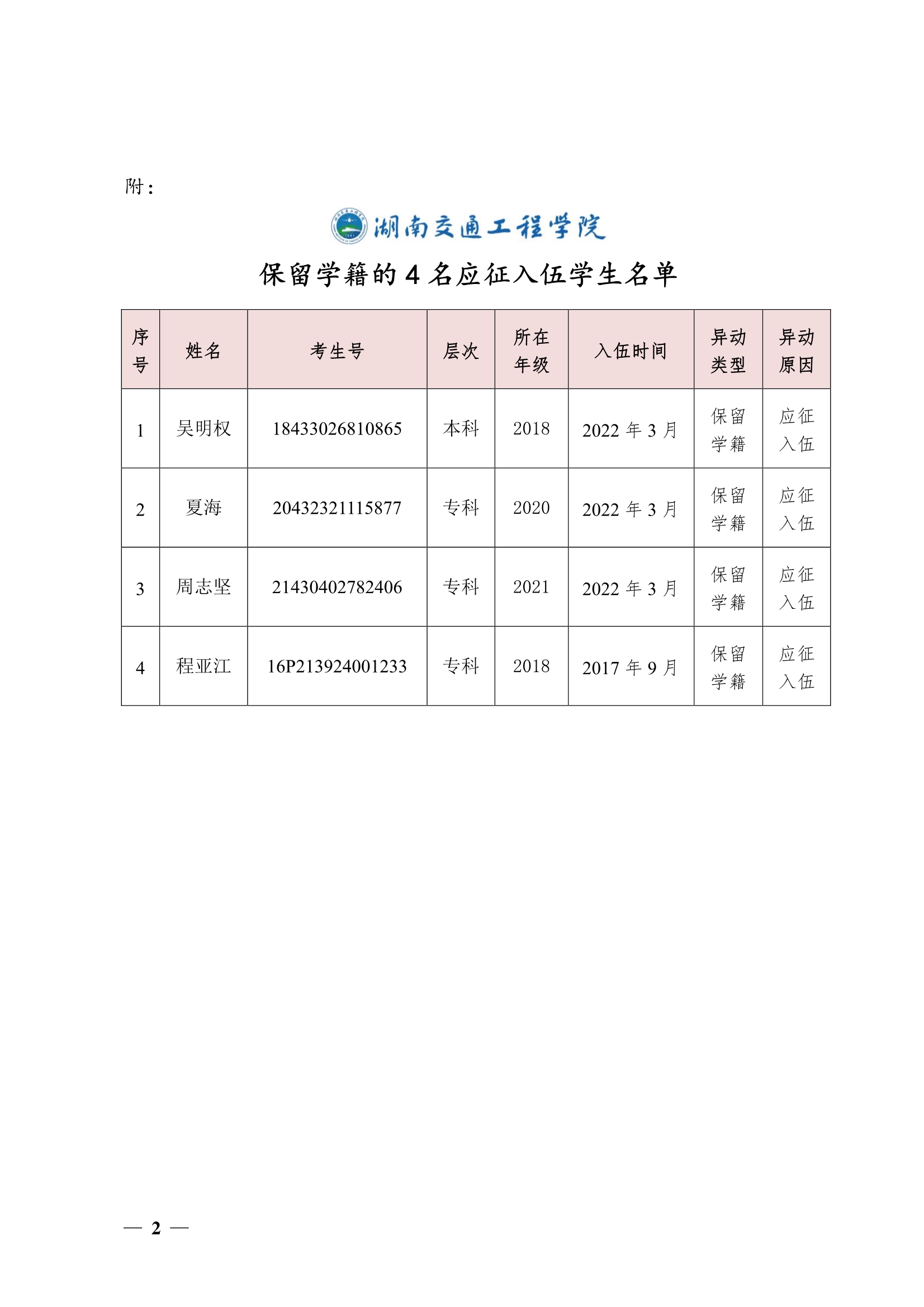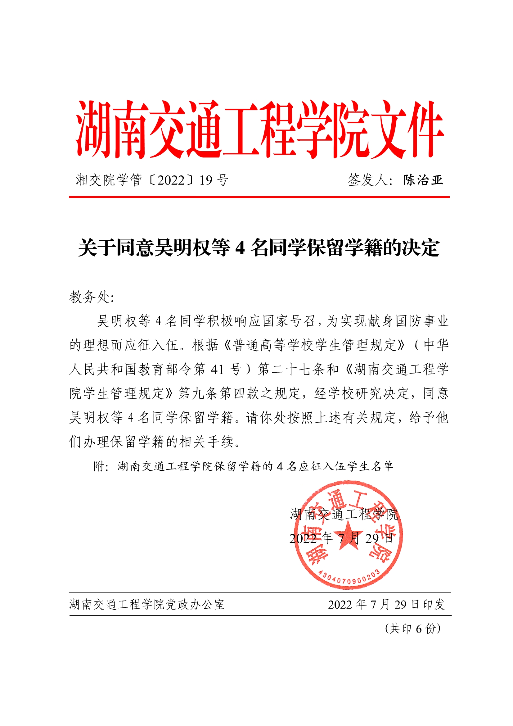 关于同意吴明权等4名同学保留学籍的决定(湘交院学管〔2022〕19号)