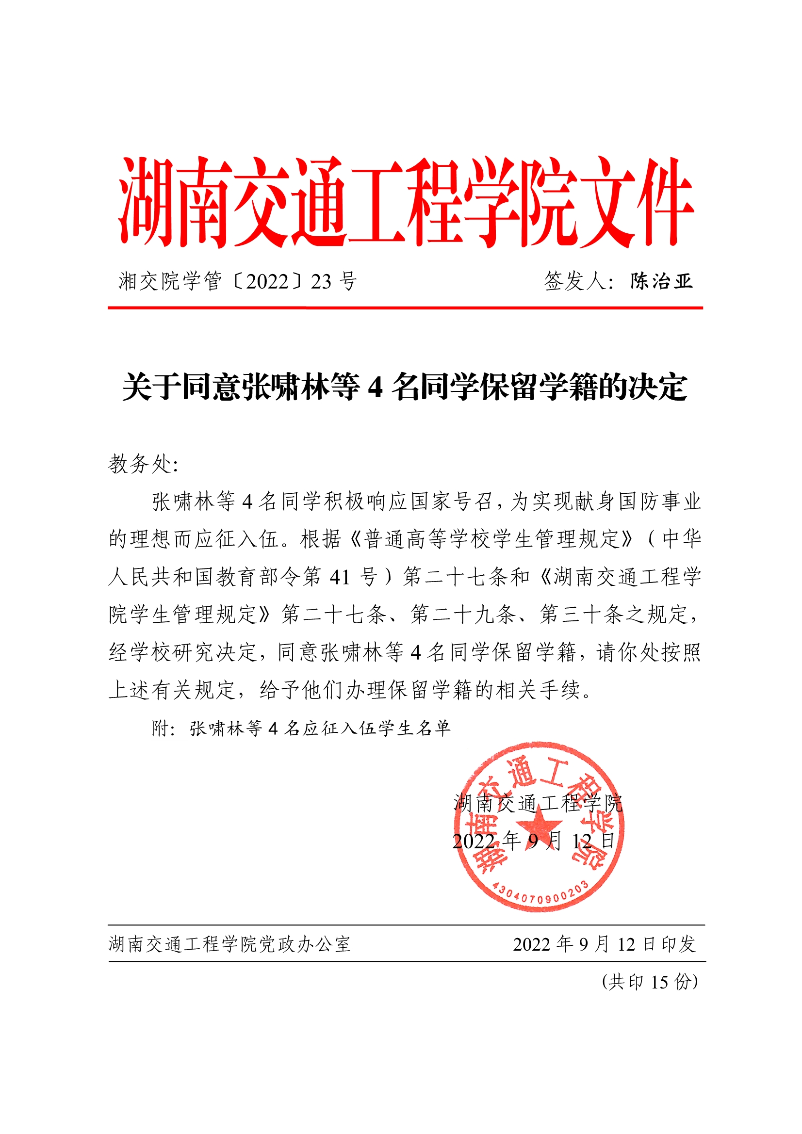关于同意张啸林等4名同学保留学籍的决定(湘交院学管〔2022〕23号)