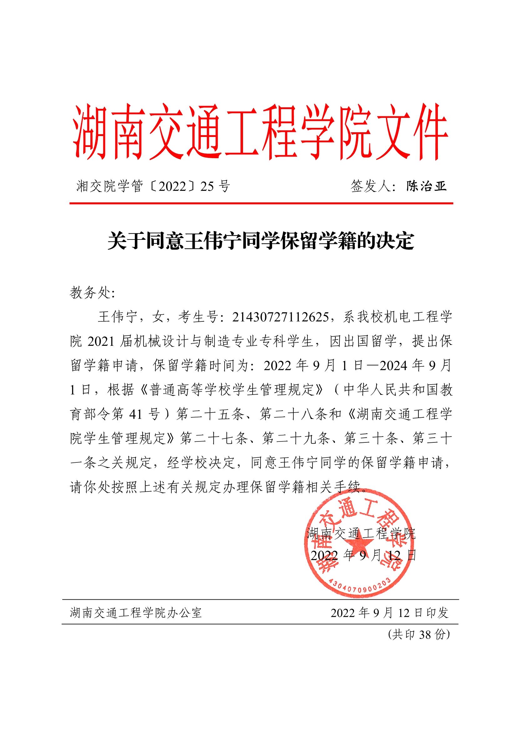 关于同意王伟宁同学保留学籍的决定(湘交院学管〔2022〕25号)