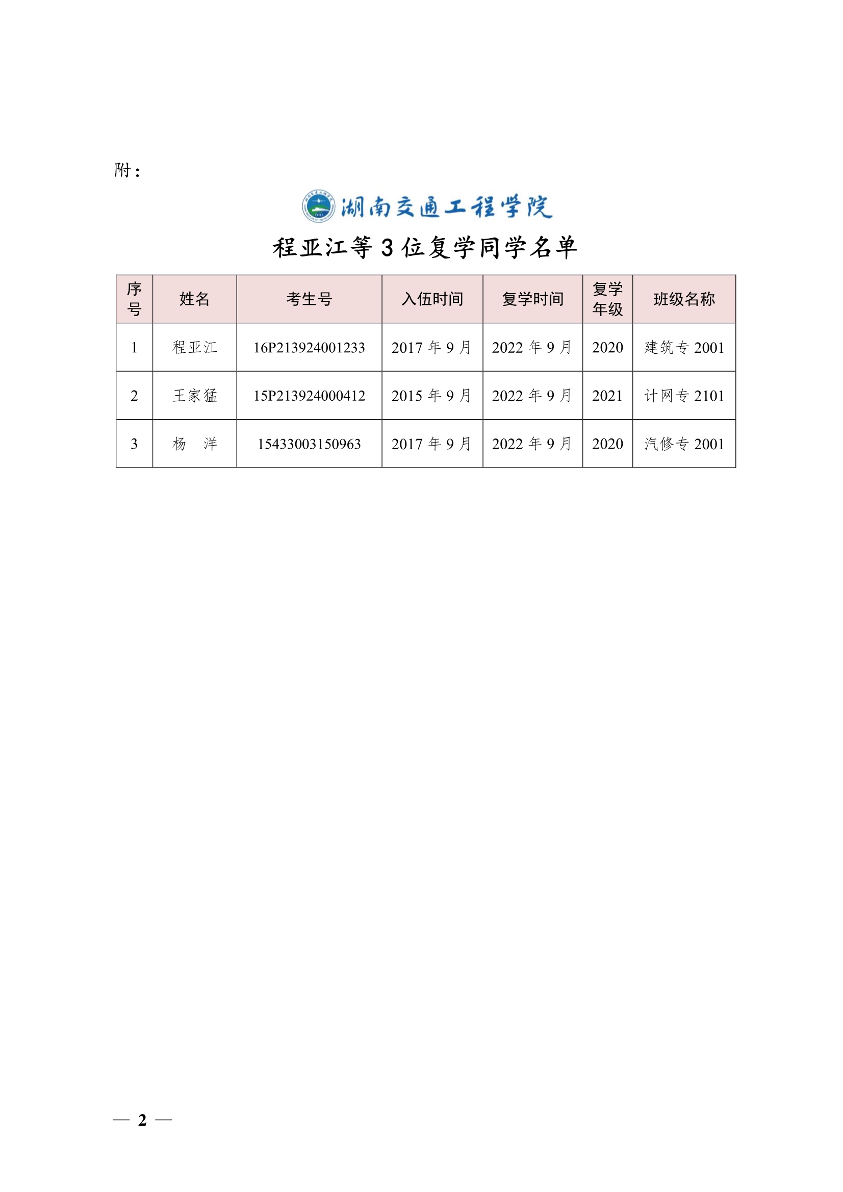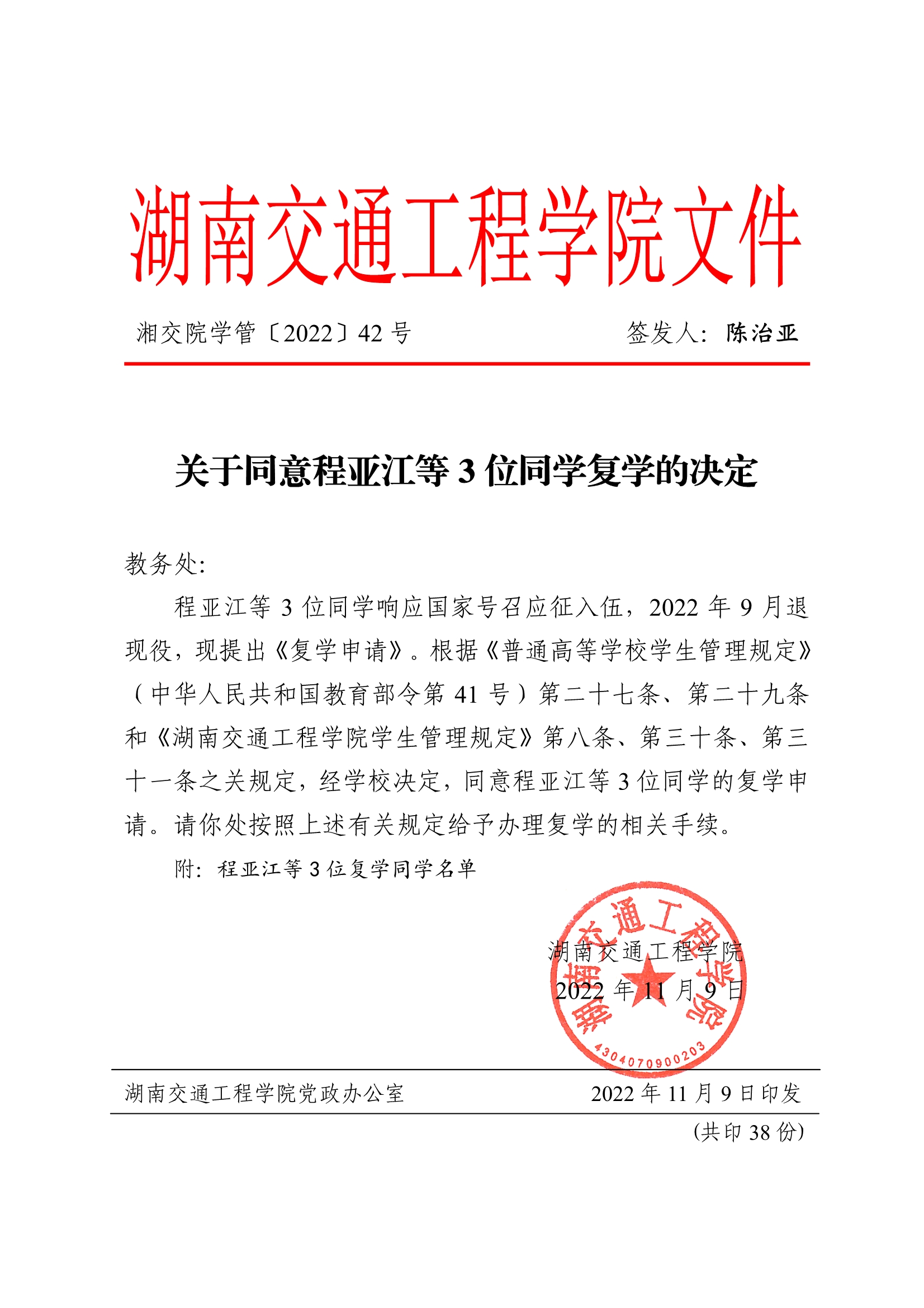 关于同意程亚江等3位同学复学的决定(湘交院学管〔2022〕42号)