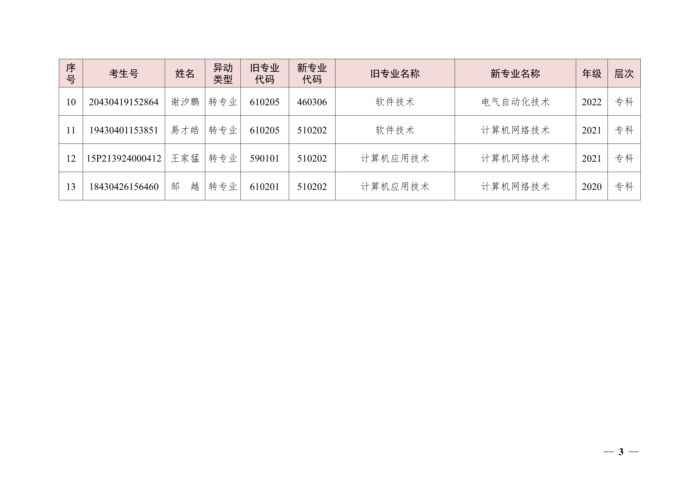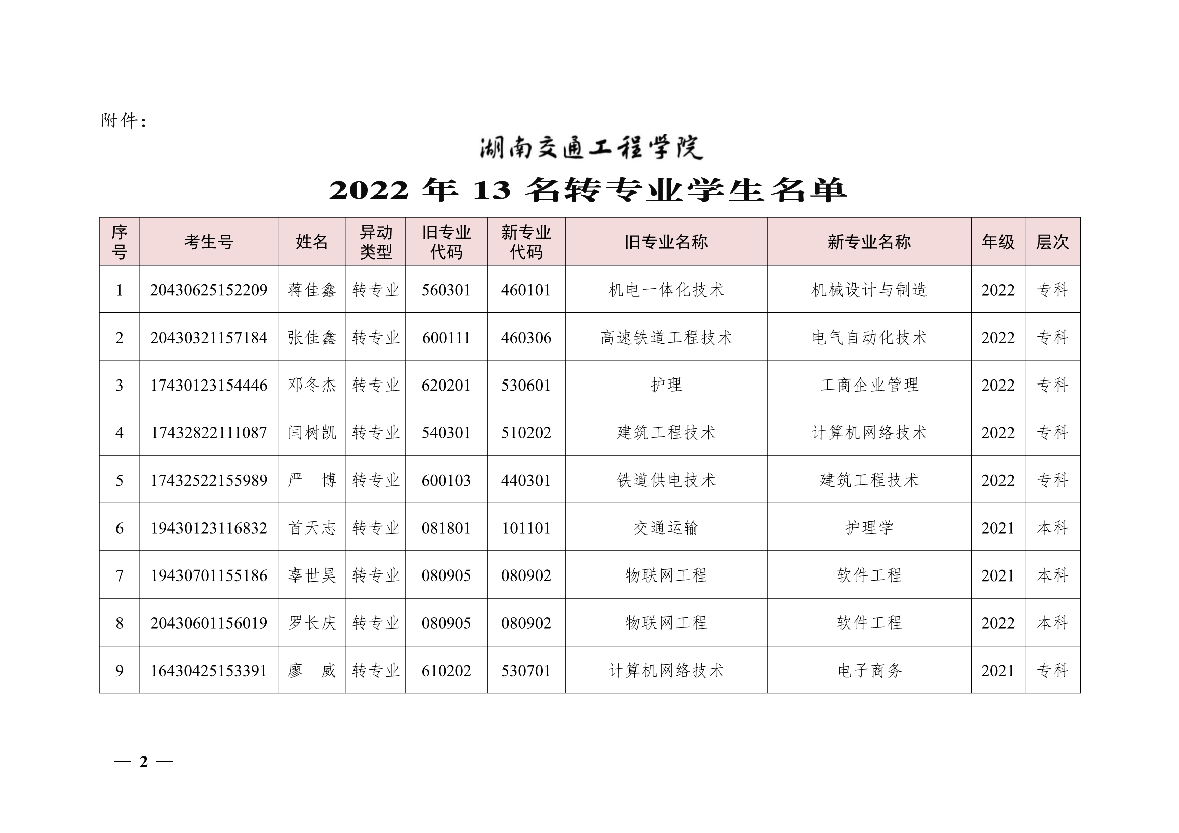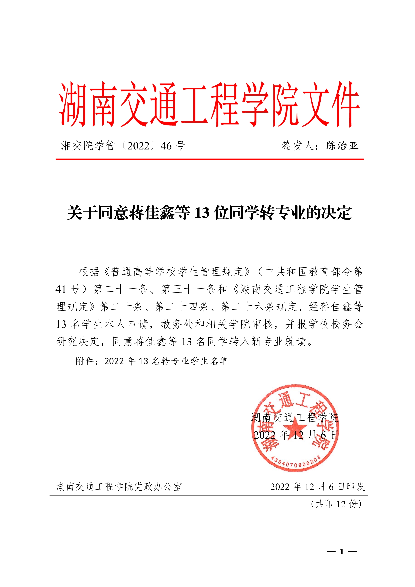 关于同意蒋佳鑫等13位同学转专业的决定(湘交院学管〔2022〕46号)