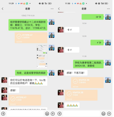 图为新葡萄8883官网AMG官网经济管理学院辅导员刘海滨代表学校两次微信转账给唐孝恒同学的父亲截图。
