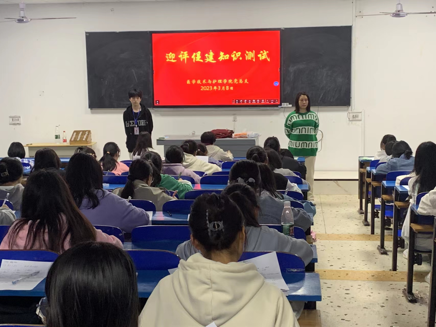 活动分为三部分。第一部分,2月27日中午12:30邓丽书记在教学楼201教室给学生干部做“迎评宣讲”会议。邓丽书记从教学工作合格评估的主要特点、新葡萄发展历史与基本情况、学生在合格评估中的使命等三个方面给学生干部做了宣讲,特别是强调了同学们要具有“校兴我荣,校衰我耻”的意识。第二部分,3月5日,医护学院辅导员开展“部署新学期工作,迎接本科合格评估”主题班会。各位辅导员围绕“四个促进、三个基本、两个突出、一个提高”这一核心内涵,向同学们讲述了本科评估的重要性和注意事项,让同学们以“主人翁”的姿态积极主动的参与到此次评估中来。第三部分,3月8日,我院组织学生开展“迎评促建知识测试”考核。动员激发同学们全员投入、全身心投入迎评促建,秉承求是态度,以优良的学风、最饱满的精神状态投入到学院“迎评促建”中去。巍巍学府,世纪传承,这次测试既是对学院教学工作的一次检查,也是对学生是否重视迎评促建的一次检验。