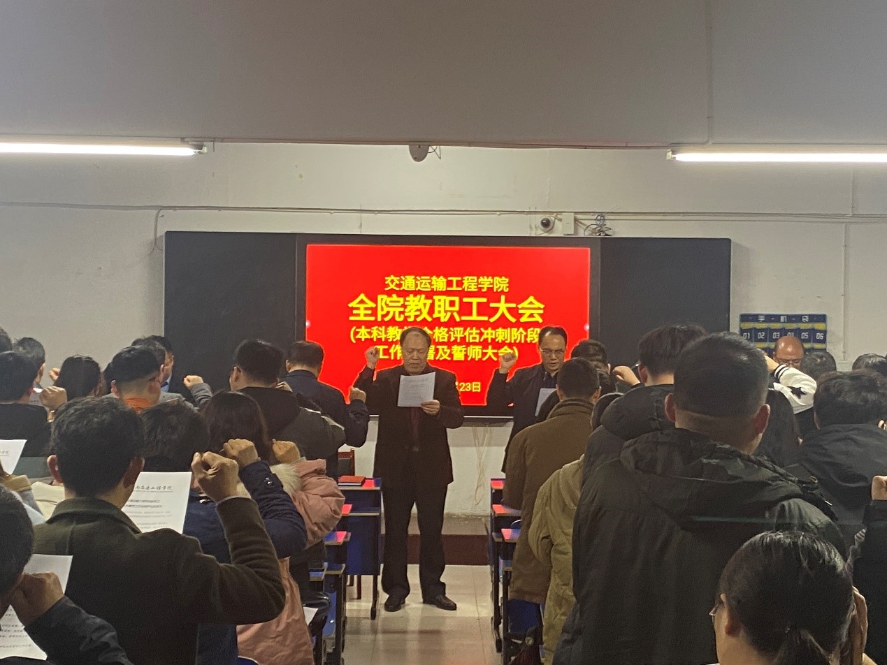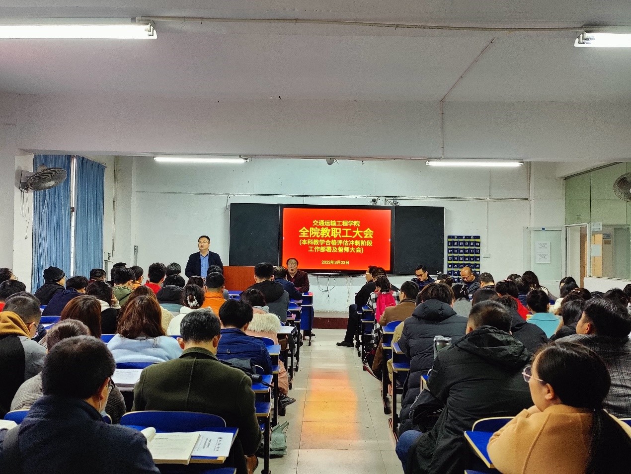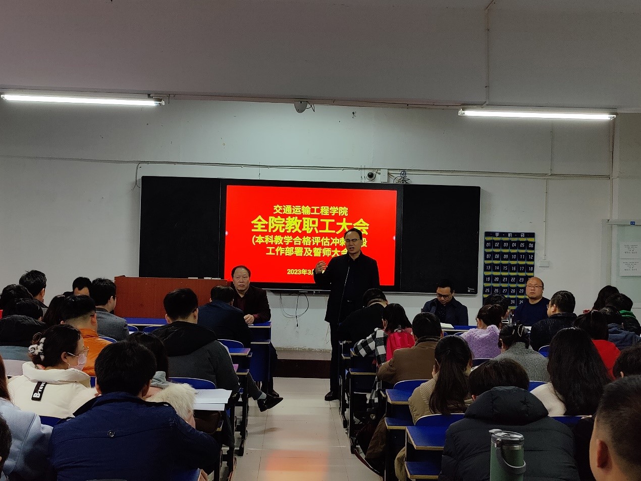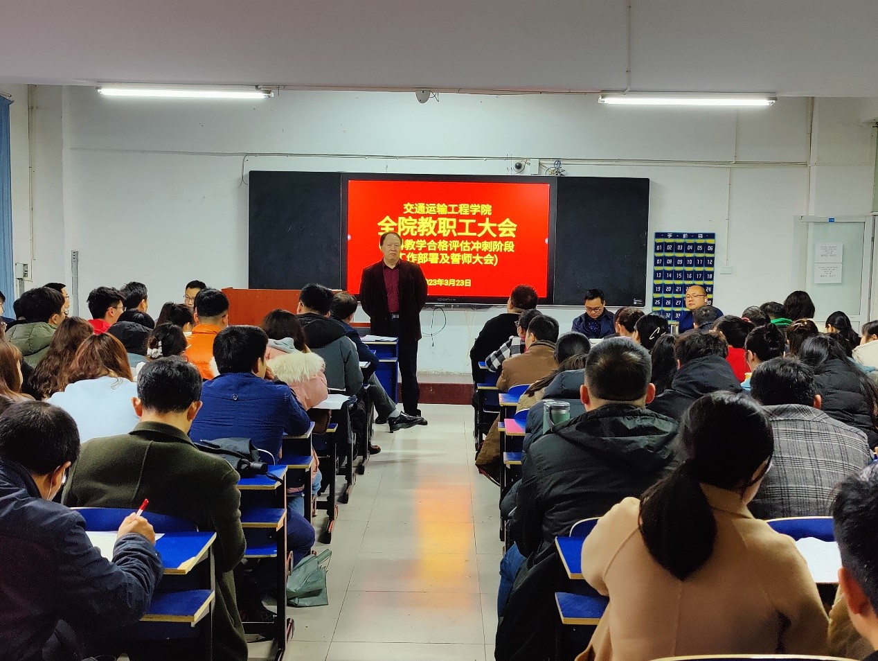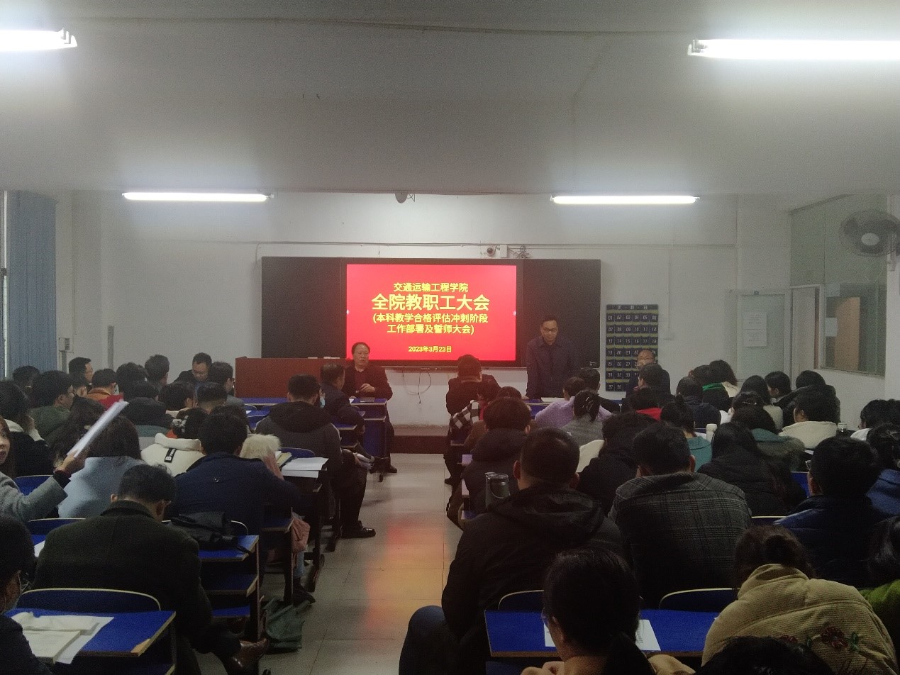 2023年3月23日下午16:15,交通运输工程学院全院教职工大会(本科教学合格评估冲刺阶段工作部署及誓师大会)在机电楼516召开,出席本次会议的有交通运输工程学院院长罗迎社、书记何美生、副院长涂宇、副院长郑哲文、副书记何文华、全院教师以及辅导员和实验员。