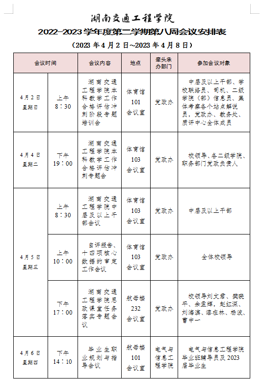 新葡萄8883官网AMG官网2022-2023学年度第二学期第八周会议安排表