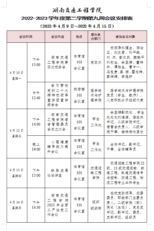 新葡萄8883官网AMG官网2022-2023学年度第二学期第十周会议安排表