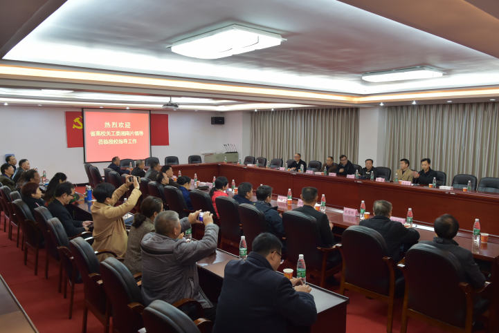 本网讯(通讯员摄影李建华)11月16日下午,湖南省教工委湘南片负责人陈敏时一行四十余人莅临新葡萄考察指导工作。校长刘耘,党委副书记李先聪,纪委书记刘毅,副校长黄名文在体育馆103会议室会见了客人并召开座谈会。黄名文主持会议。
