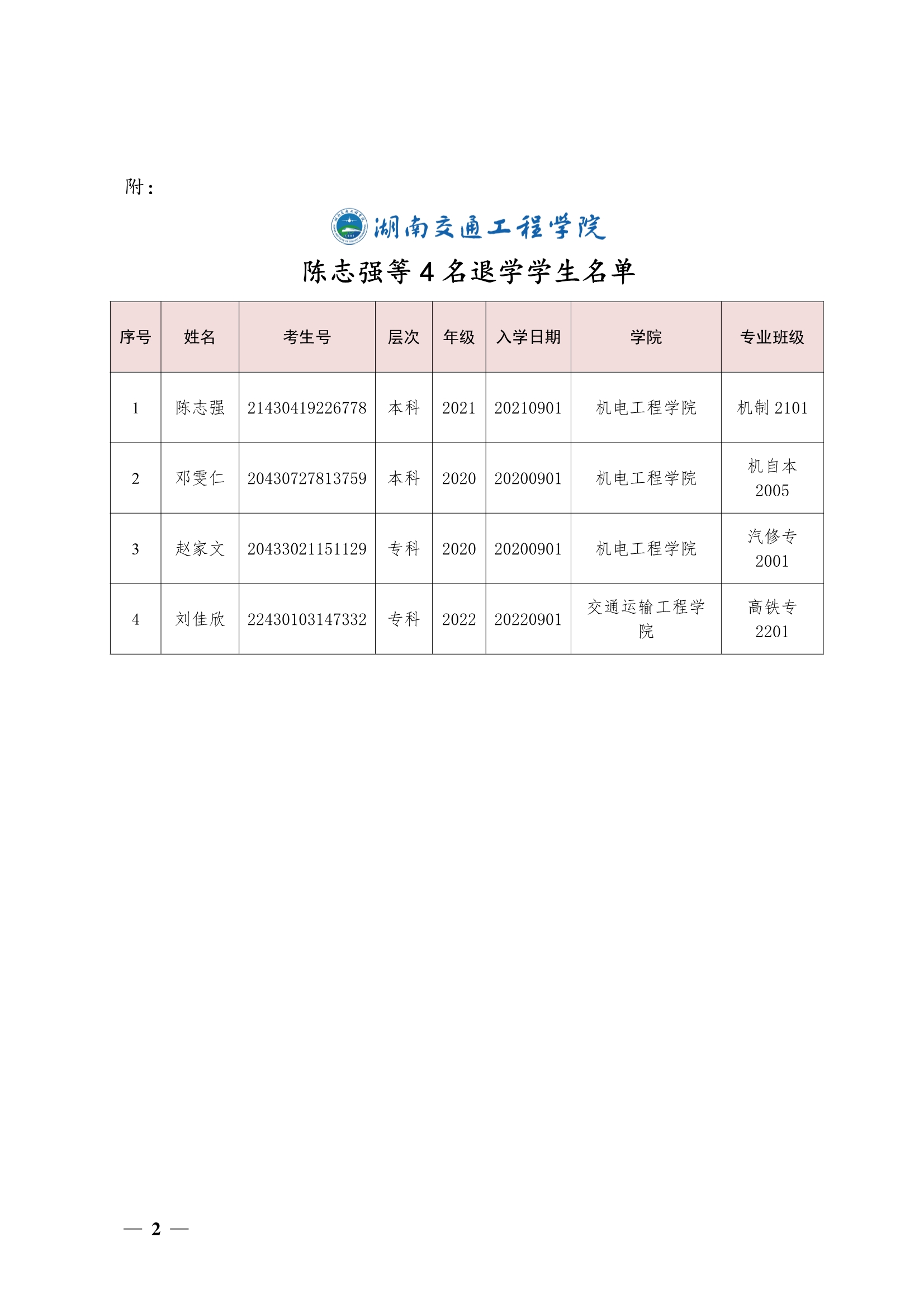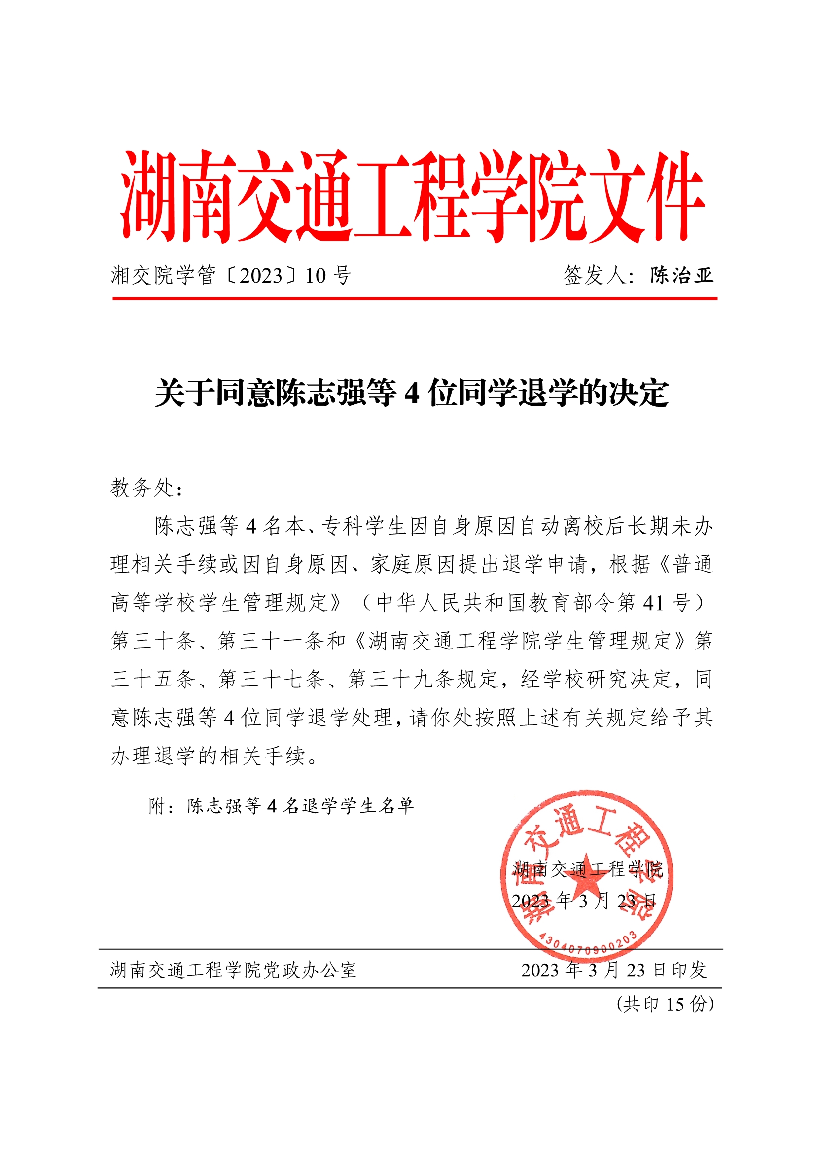 关于同意陈志强等4位同学退学的决定(湘交院学管〔2023〕10号)