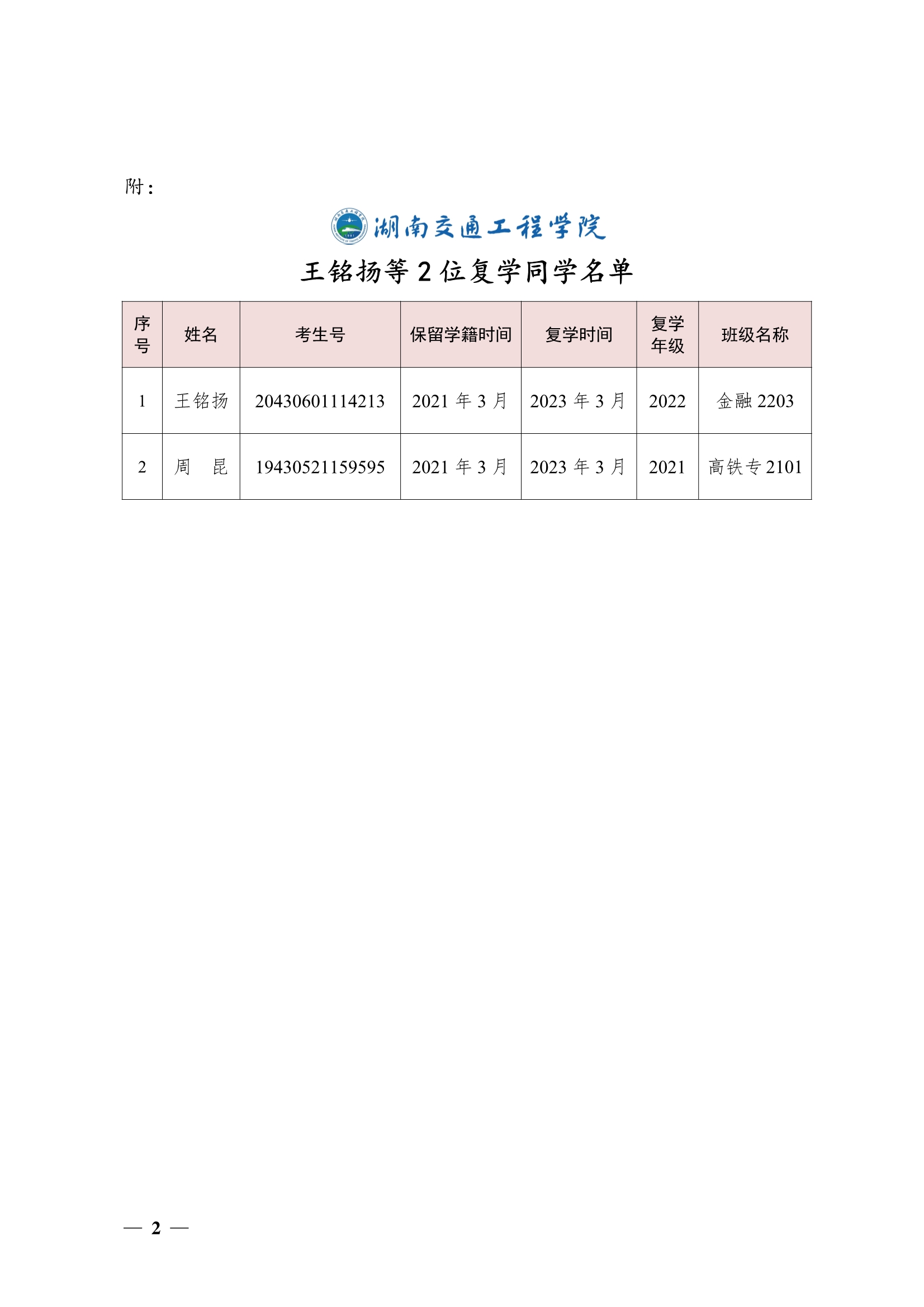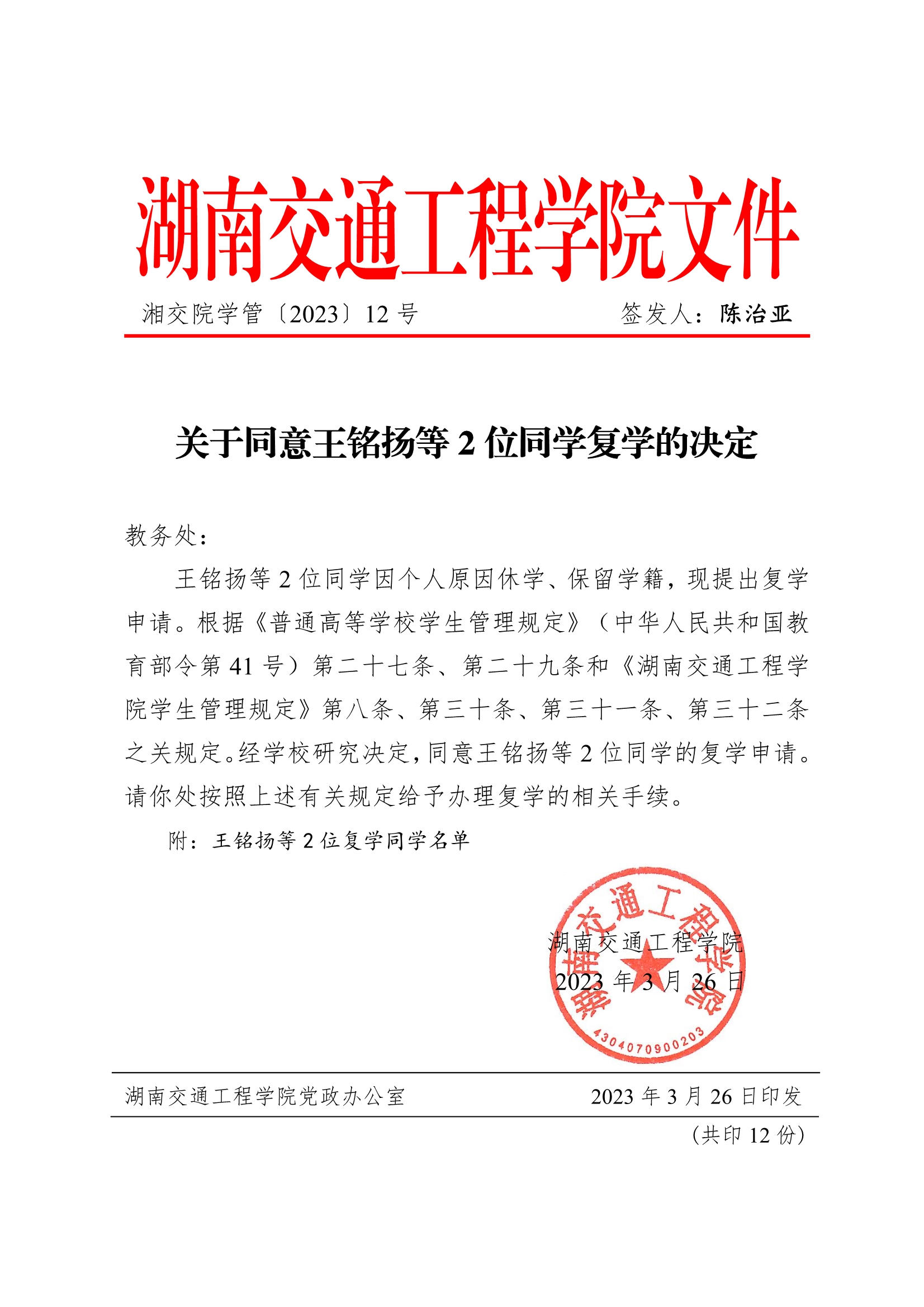 关于同意王铭扬等2位同学复学的决定(湘交院学管〔2023〕12号)