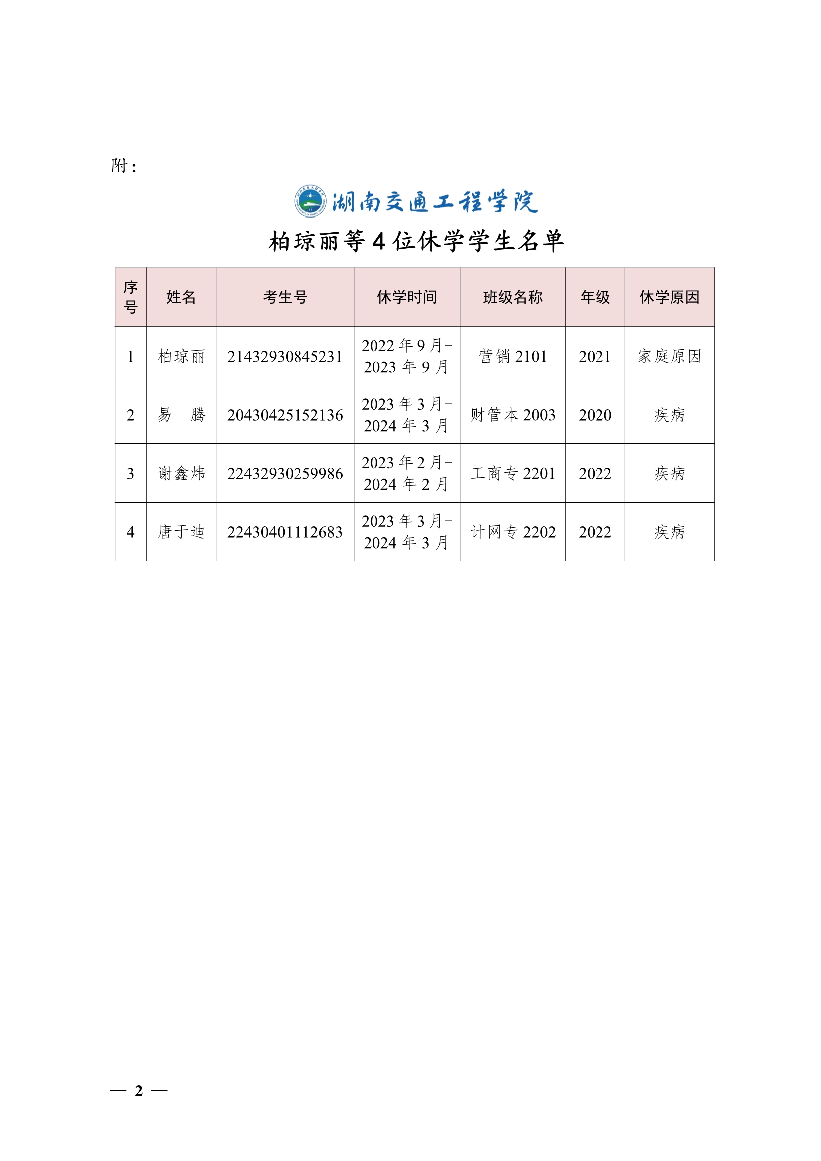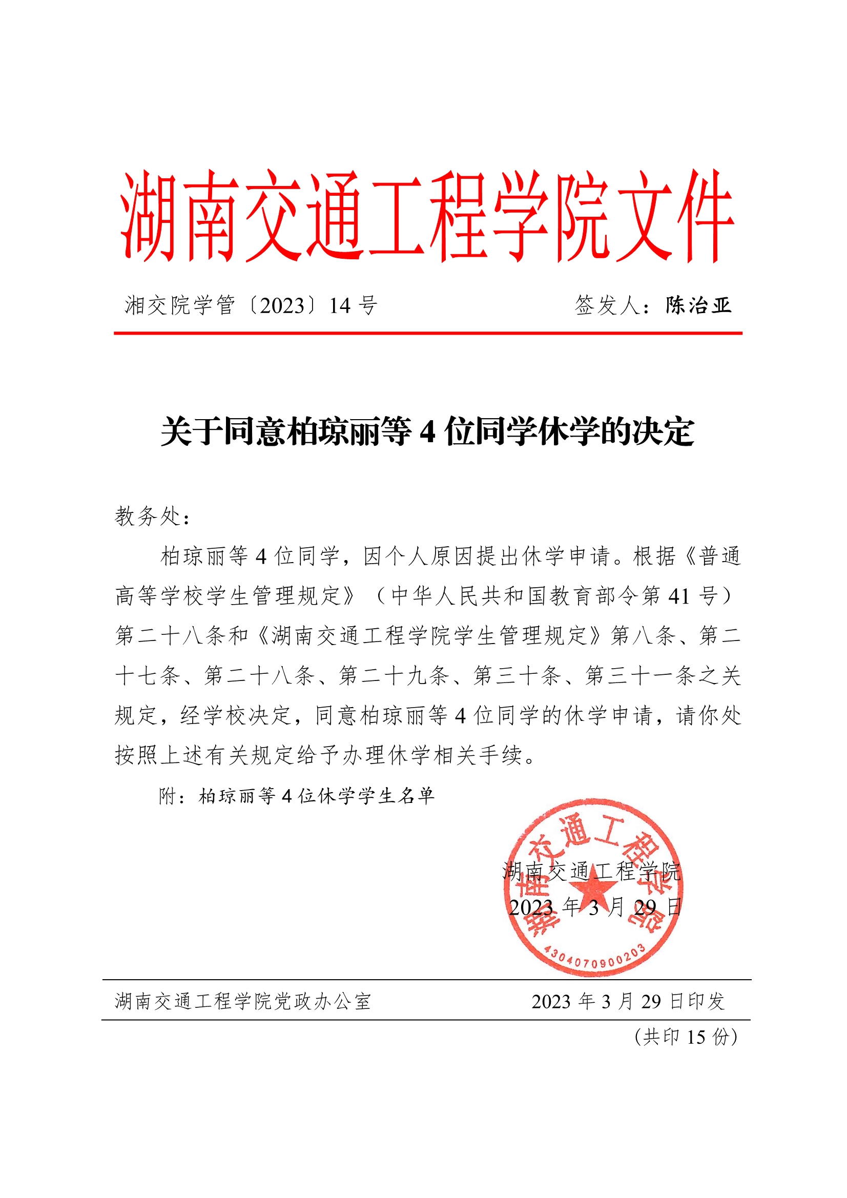 关于同意柏琼丽等4位同学休学的决定(湘交院学管〔2023〕14号)