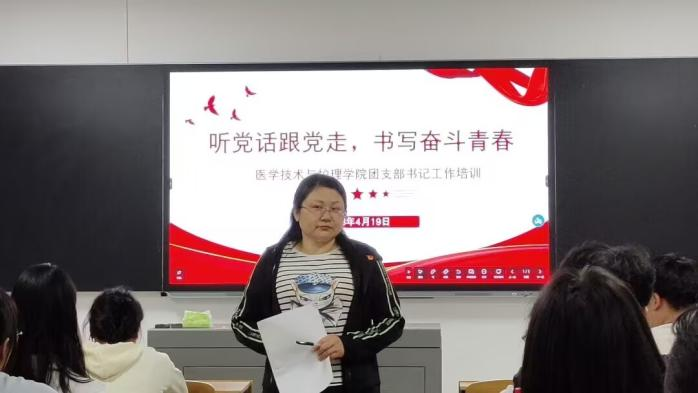 为进一步落实团组织管理,扎实推进各项工作进程,医学技术与护理学院于4月19日晚,在教学楼204教室召开了以“听党话跟党走,书写奋斗青春”为主题的团支部书记培训会议,出席本次会议的有党总支副书记兼团总支书记肖桂香,各班团支书、学院团总支各部门代表。
