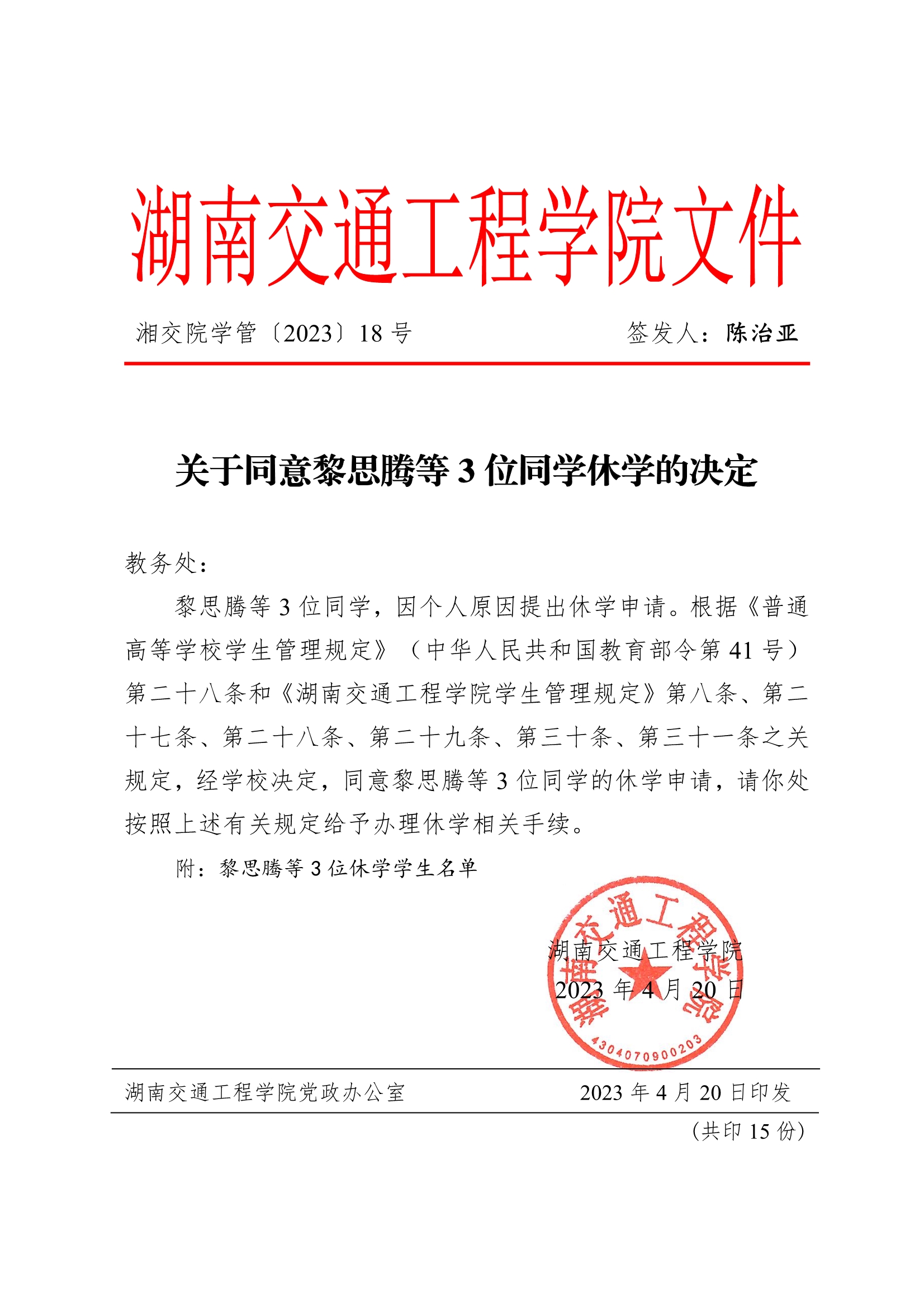 关于同意黎思腾等3位同学休学的决定(湘交院学管〔2023〕18号)