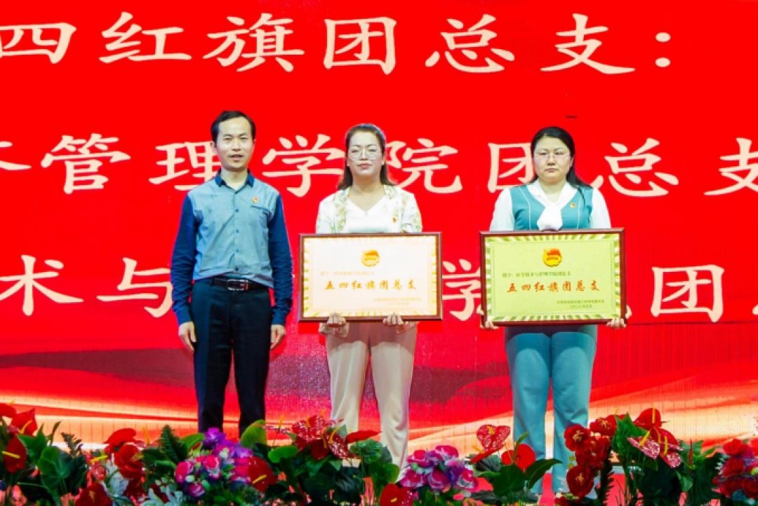 在各篇章间隙穿插举行了“五四”评优表彰仪式,一批五四红旗团总支、团支部、十佳团支书、红旗标兵、优秀团务工作者、大学生良师益友、学雷锋志愿标兵、优秀志愿者、优秀班集体、优秀团干部、优秀团员、优秀学生干部、优秀学生等先进集体和先进个人依次登上奖台接受校领导颁奖。