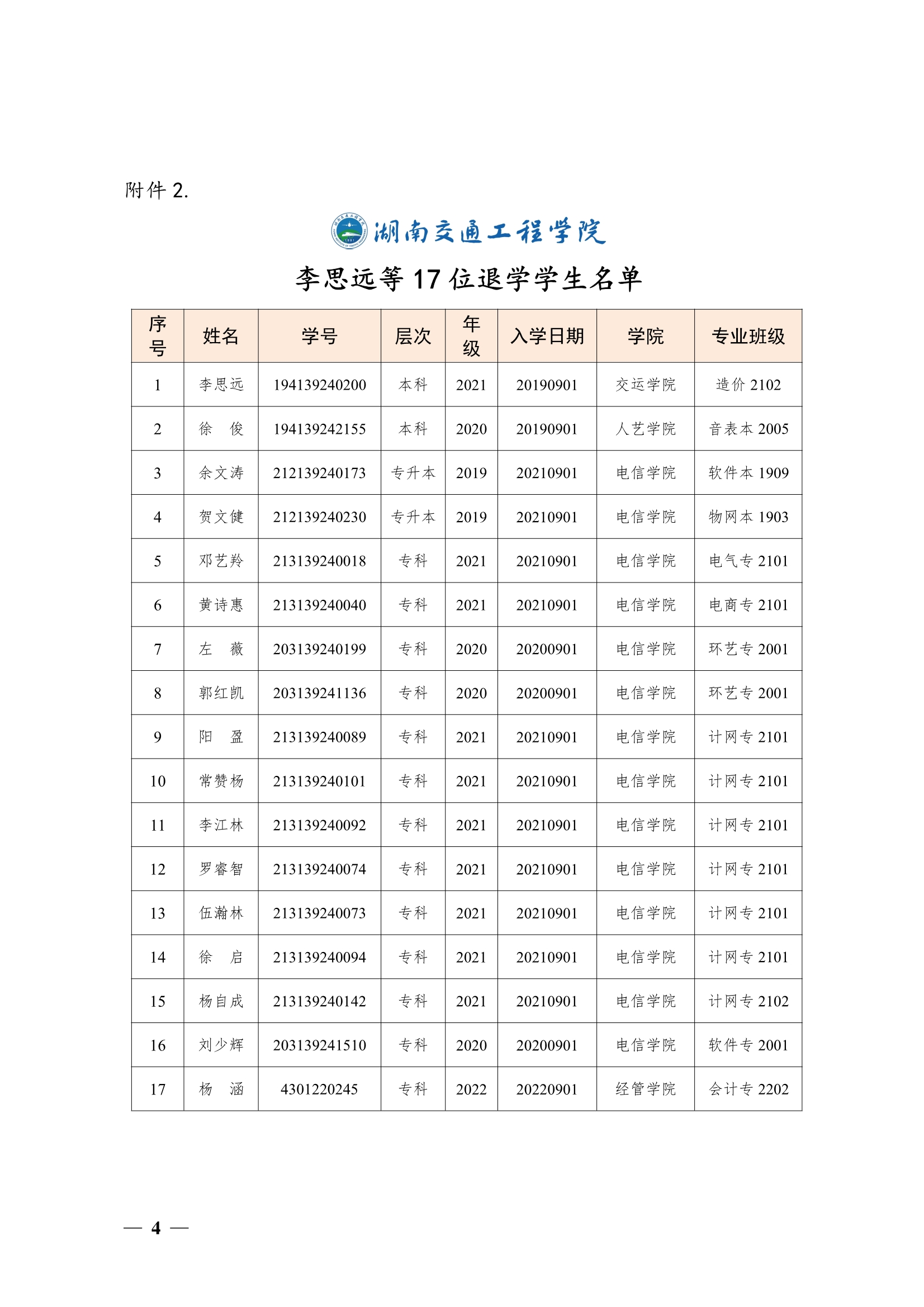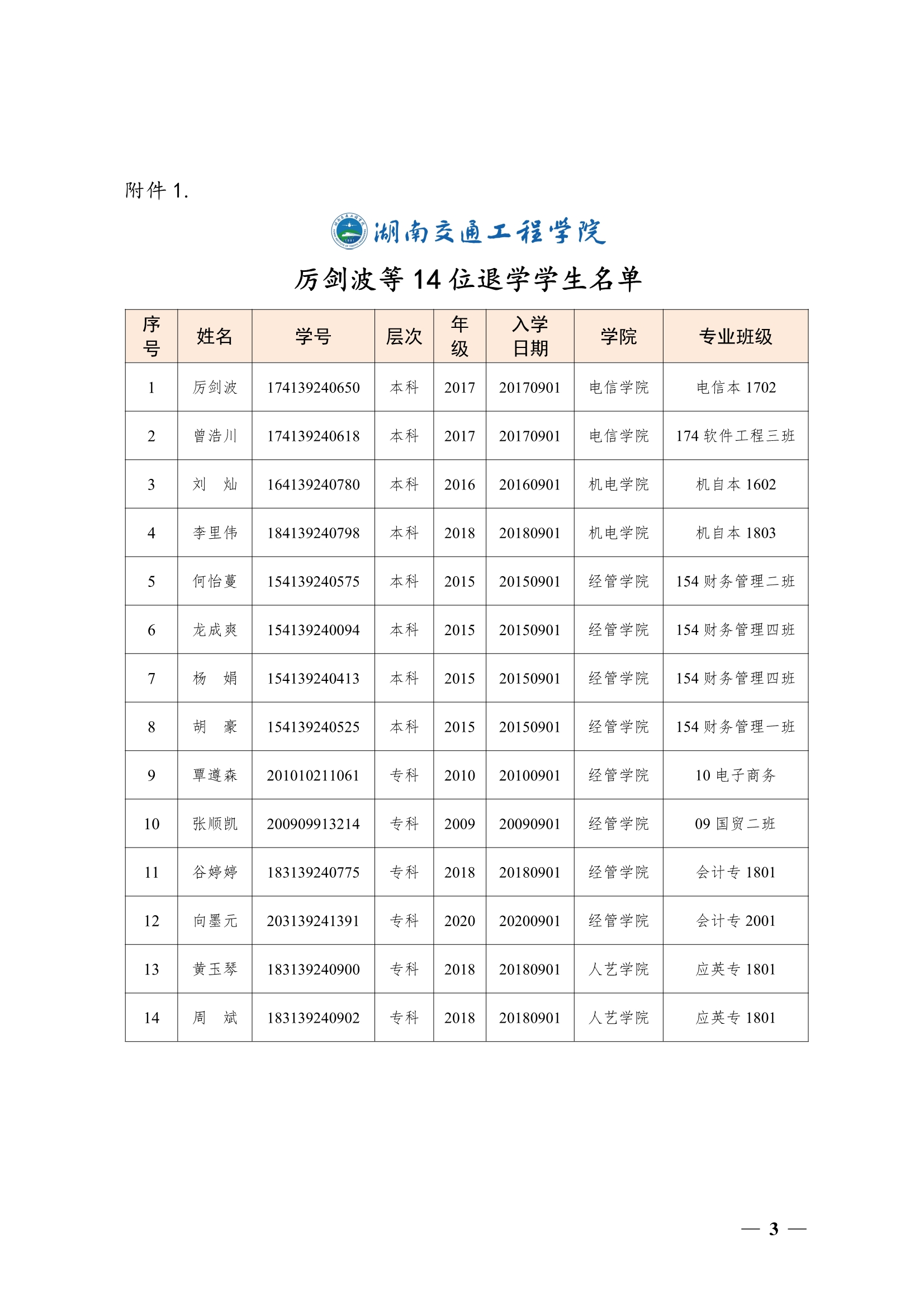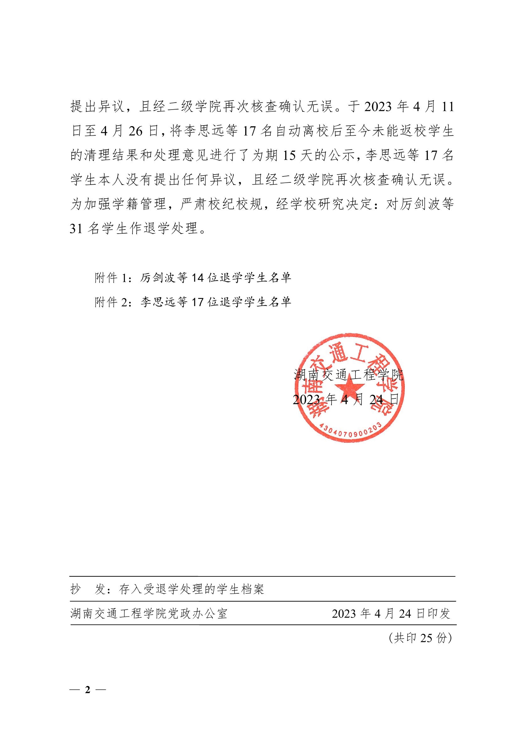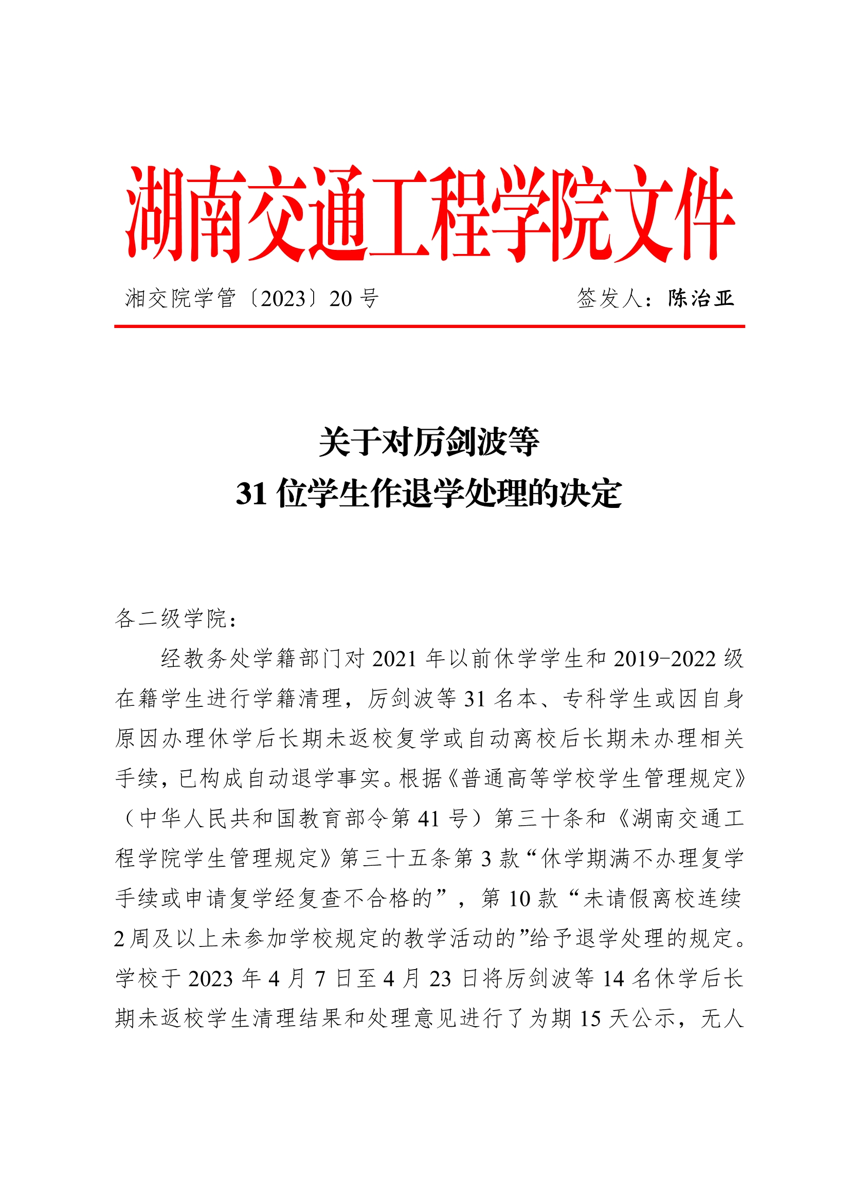 关于对厉剑波等31位同学作退学处理的决定(湘交院学管〔2023〕20号)