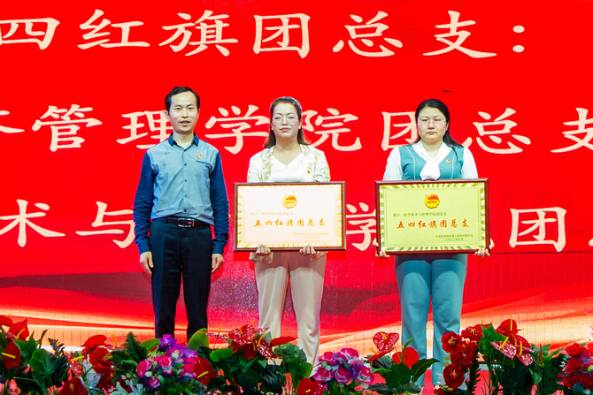 在各篇章间隙穿插举行了“五四”评优表彰仪式,一次次将晚会气氛推向高潮。在热烈的掌声中,一批五四红旗团总支、团支部、十佳团支书、红旗标兵、优秀团务工作者、大学生良师益友、学雷锋志愿标兵、优秀志愿者、优秀班集体、优秀团干部、优秀团员、优秀学生干部、优秀学生等先进集体和先进个人依次登上奖台接受校领导颁奖。