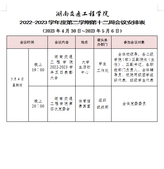 新葡萄8883官网AMG官网2022-2023学年度第二学期第十二周会议安排表