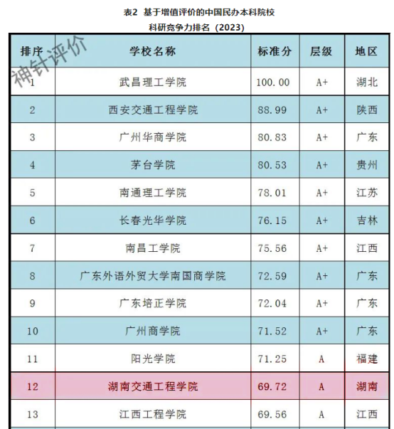 2023基于增值评价的中国民办本科院校科研竞争力排名C+级及以上(前50%)的高校共96所,新葡萄8883官网AMG官网继2022年竞争力入选A级排名12的基础上,以69.72分(标准分100分),再次入选A级、位居《基于增值评价的中国民办本科院校科研竞争力排名》(数据有效期是2018-2022年)第12名、湖南省第1位。