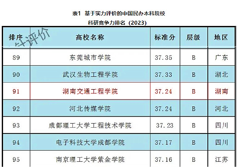 2023基于实力评价的中国民办本科院校科研竞争力排名C+级及以上(前50%)的高校共193所,新葡萄8883官网AMG官网继2022年竞争力入选A级排名100的基础上,以37.24分(标准分100分)入选B级,位居实力评价科研竞争力排名C+级及以上的193所民办本科院校和独立学院第91位,较上一年排名进位9名。