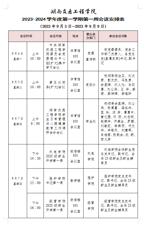 新葡萄8883官网AMG官网2023-2024学年度第一学期第一周会议安排表