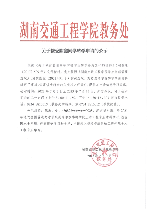 关于陈鑫同学转学申请的公示