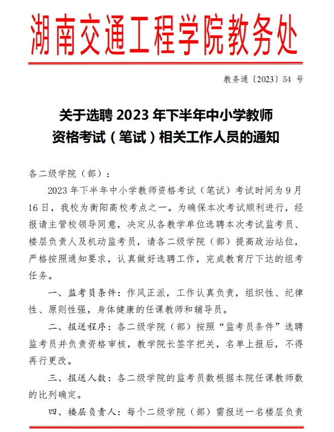 关于选聘2023年下半年中小学教师资格考试相关工作人员的通知