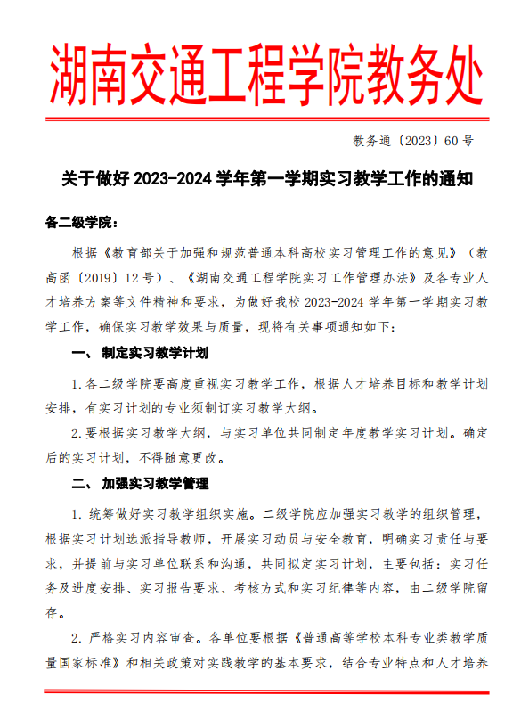 关于做好2023-2024学年第一学期实习教学工作的通知