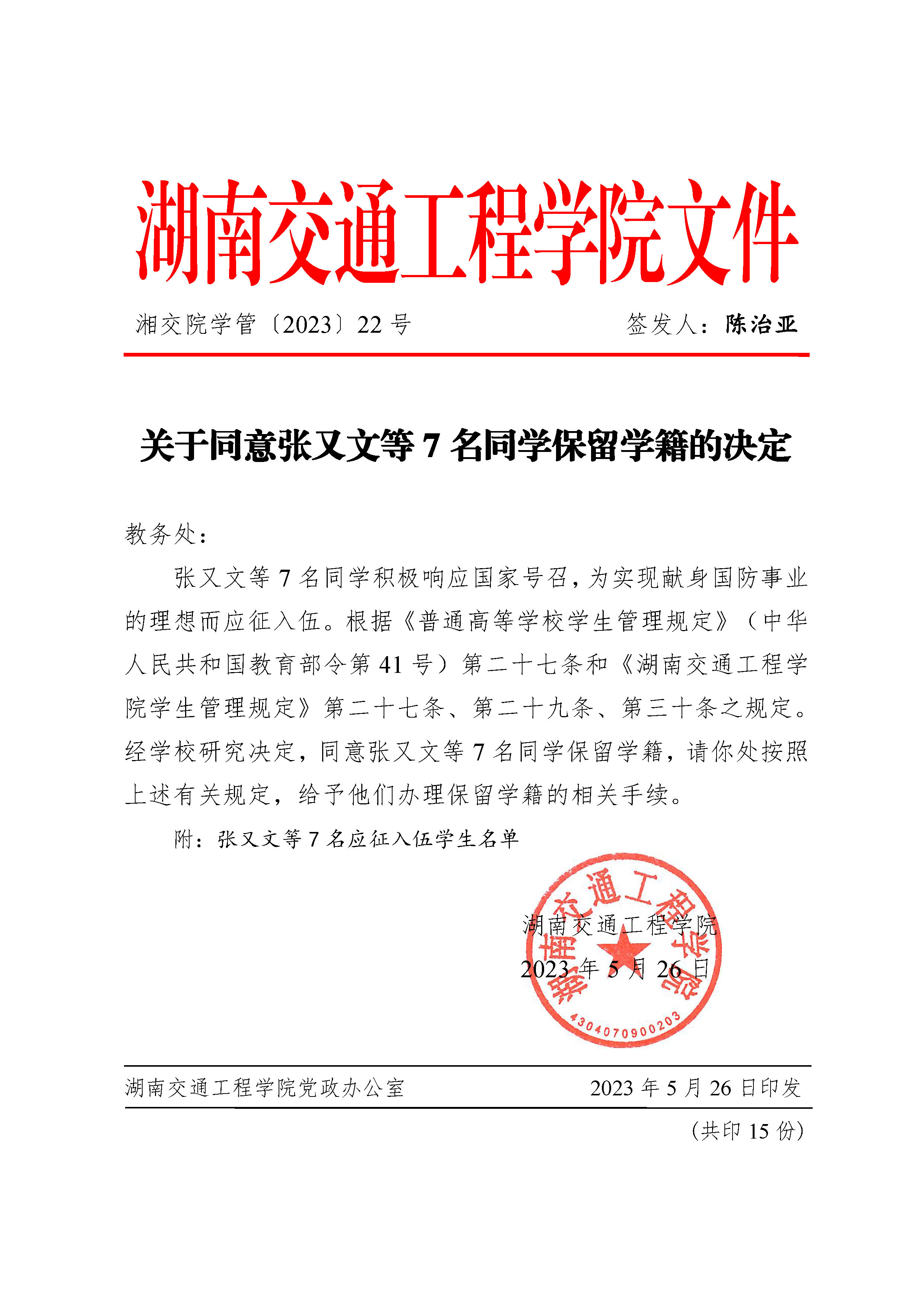 关于同意张又文等7名同学保留学籍的决定(湘交院学管〔2023〕22号)