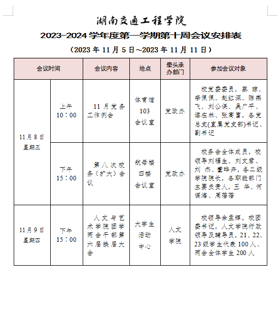 新葡萄8883官网AMG官网 2023-2024学年度第一学期第十周会议安排表